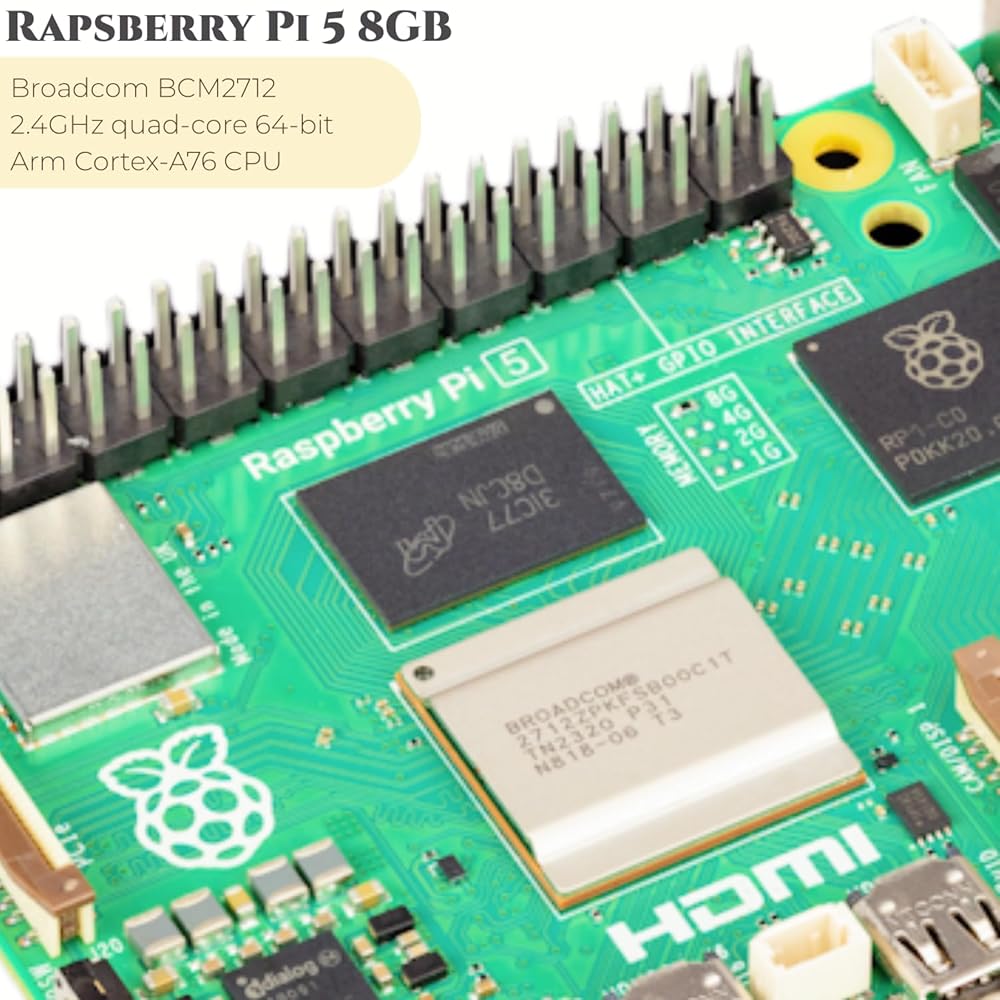 تتضمن لوحة Pi 5 8 جيجابايت مع وحدة المعالجة المركزية Broadcom BCM2712 2.4 جيجا هرتز رباعية النواة 64 بت Arm Cortex-A76