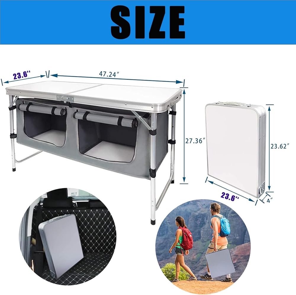 【PRODUCT SIZE】Expand Dimension:120*60*70cm/47.2*23.6*27.6inch. Package Dimension: 63*63*10cm/24.8*24.8*3.94inch. Featuring with the foldable design, our camping table can be easily folded into a suitcase. Folding camping table sets up in seconds.