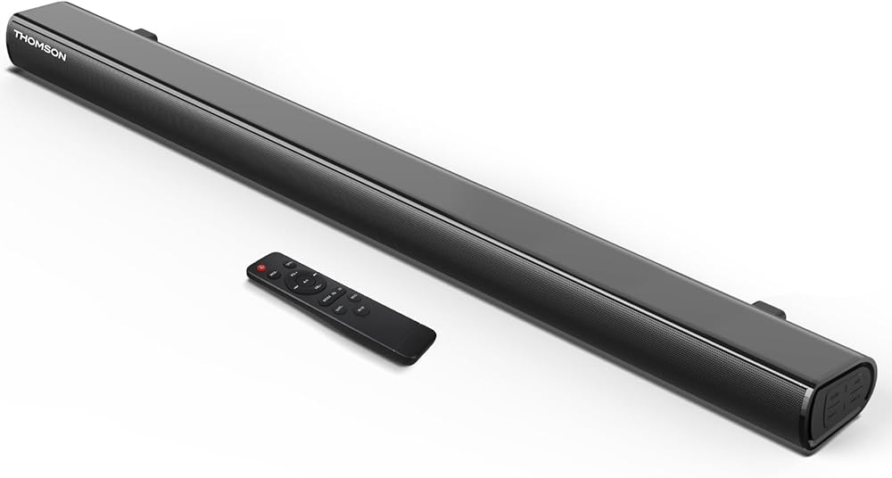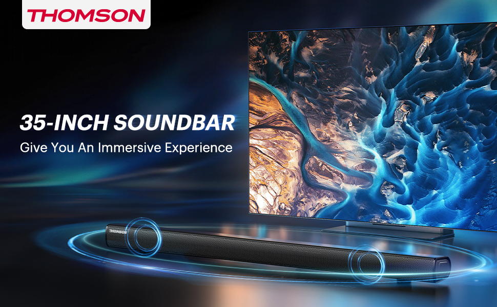 سماعات تلفزيون ساوند بار مقاس 35 بوصة من طومسون، مكبرات صوت بلوتوث للمسرح المنزلي مع مكبر صوت انعكاسي، صوت DSP وقابل للتعديل على الحائط، HDMI/ARC/AUX/Opti/Coax/USB