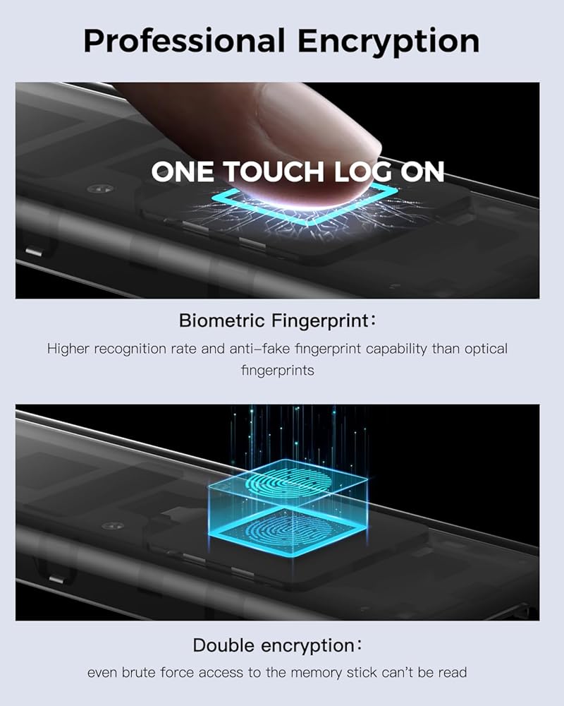 • 【تشفير عميق - كسر مضاد للعنف】يمكن فتح SSD رقميًا أو عن طريق بصمة الإصبع عند توصيله بالهاتف بعد التشفير، إذا حاول شخص ما إخراج عصا ذاكرة SSD بعنف بعد التشفير، فلن يتمكن من قراءتها، مما يتيح لك مساحة خاصة موثوقة بنسبة 100%.
