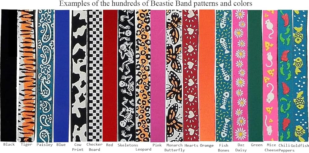 Beastie Band Cat Collars are one of the most comfortable collars on the market. They're designed by cat lovers who wanted something comfortable, safe, and long-lasting for their furry feline friends. Beastie bands are made of soft and stretchy neoprene. It's very lightweight and stretches for safety. Can be cut to size, so getting a great custom fit is easy whether you have a tiny kitten or a massive "couch potato" kitty. Measures 12 1/2 inches long without being stretched. Features Velcro closure and metal eyelet for attaching ID tags.