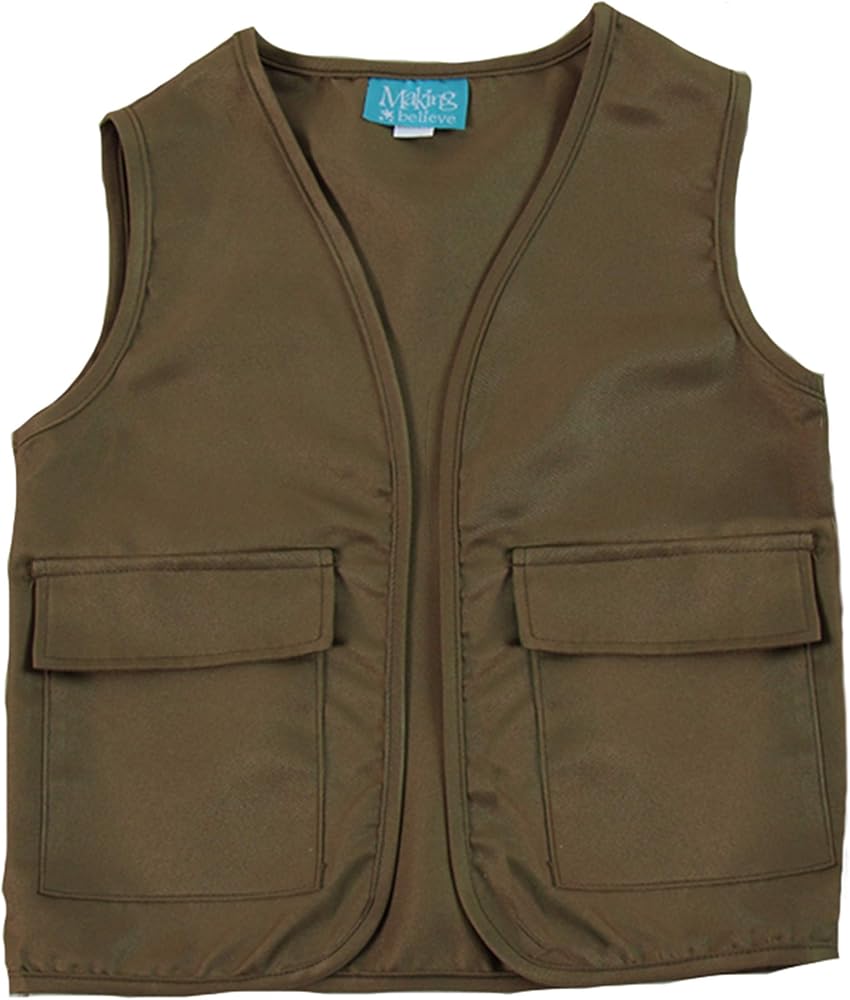 Basic patch pocket vest costume for a zoo, army or safari theme birthday party, Halloween costume or everyday play. Includes vest only and drawstring bag. Quality vest has a finished hem on all edges. Polyester fabric for easy care and wear. Brown color has a khaki hue, which makes for a versatile costume. Machine wash, lay flat to dry. Imported