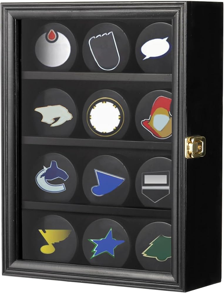 علبة عرض بيكيث باك يمكنها استيعاب 12 قرصًا. يبلغ مقاس حامل عرض القرص هذا 14.4 بوصة × 11 بوصة × 3.9 بوصة. ملاحظة: قرص الهوكي غير متضمن في صندوق العرض.