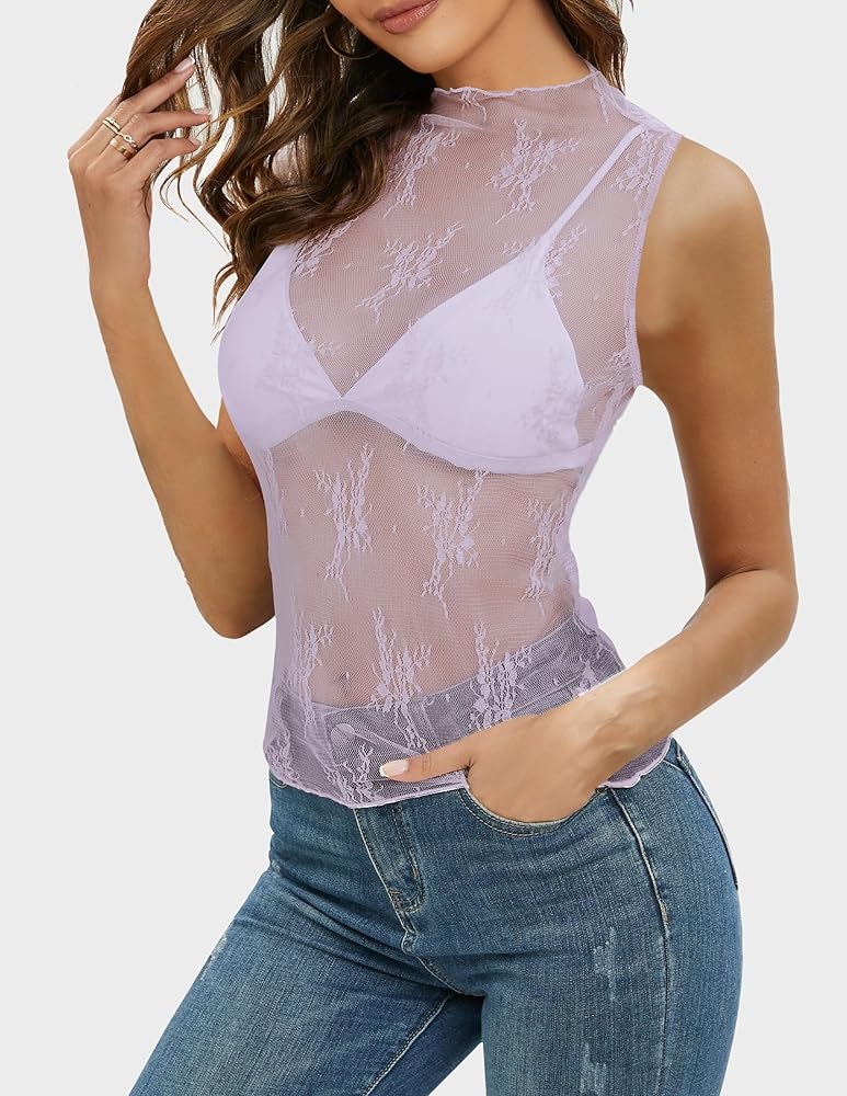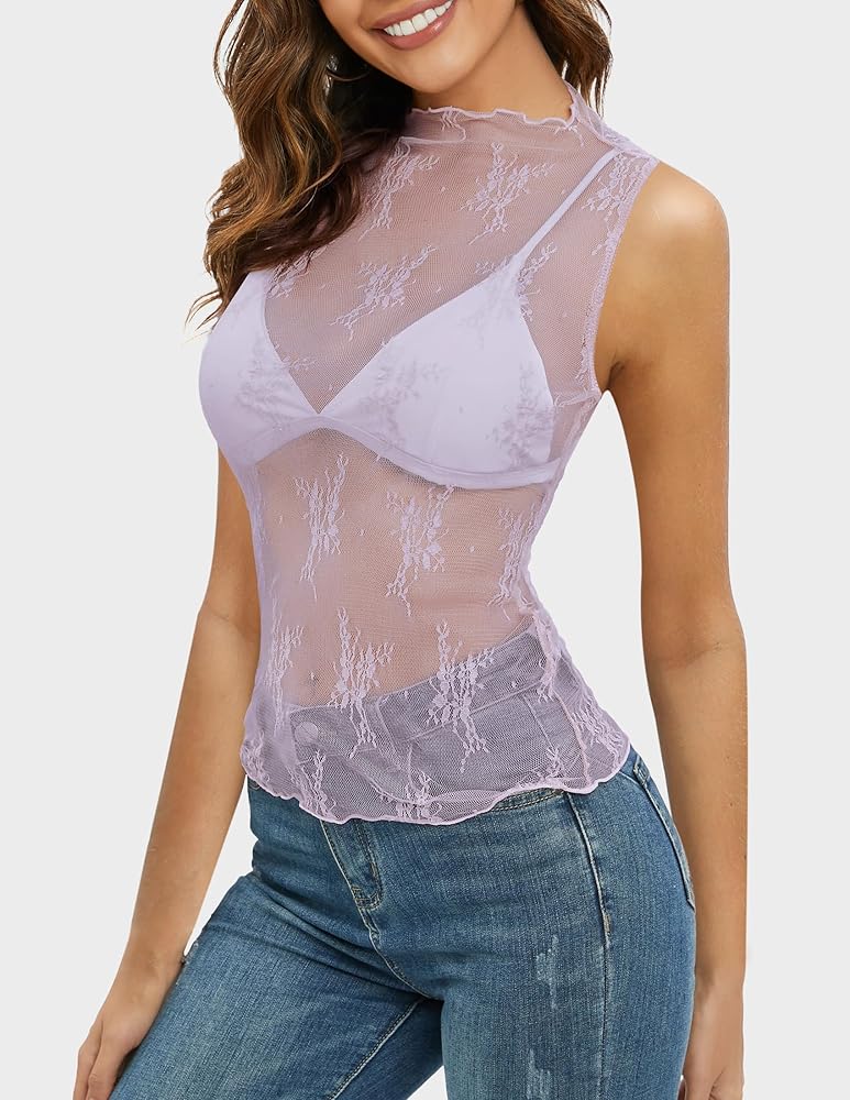 جودة فاخرة: هذا القميص الشبكي مصنوع من نسيج الدانتيل الشفاف، وهو ناعم ومسامي وقابل للتمدد ومواكبة لفصل الصيف!