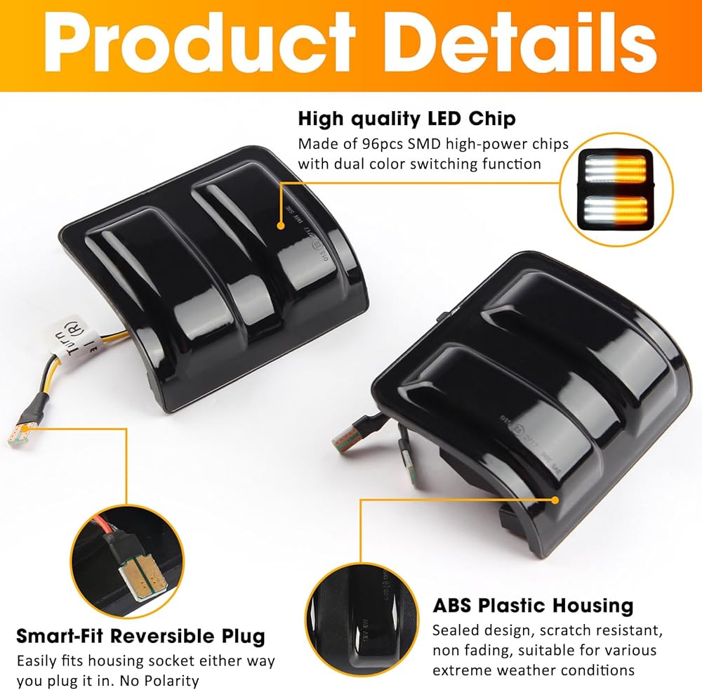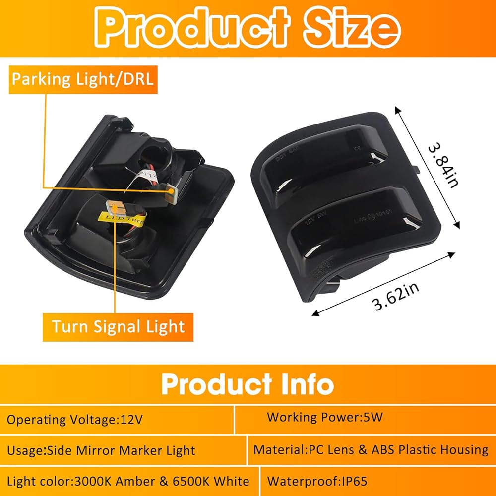 سهلة التركيب -- التوصيل والتشغيل، استبدال مباشر لضوء علامة مرآة المصنع، لا حاجة إلى تعديل أو تشذيب، لا حاجة لمقاومات إضافية أو مرحل