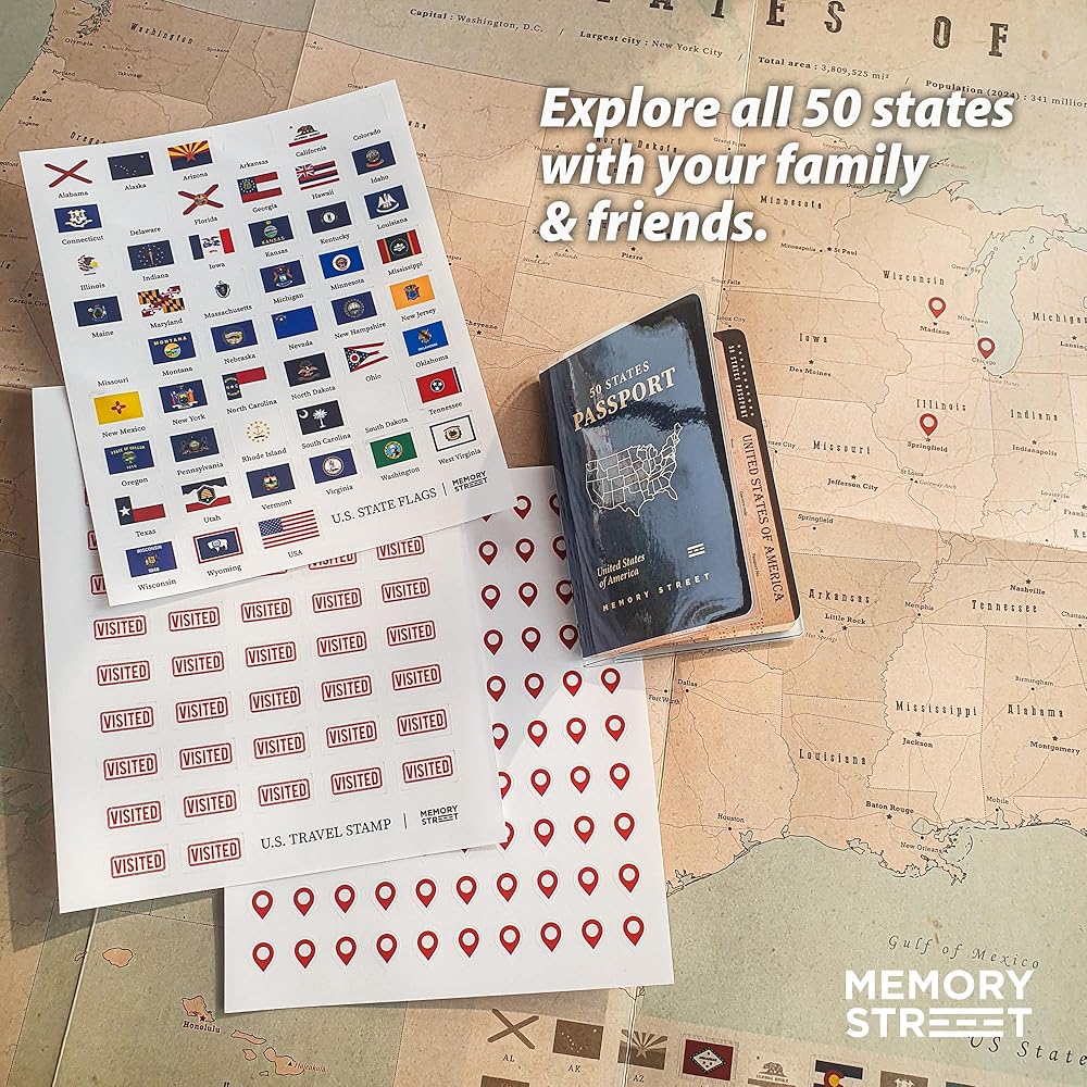 US 50 States Passport & Travel Map Kit, United States Flags Stickers Poster Gift for Travelers USA National Parks