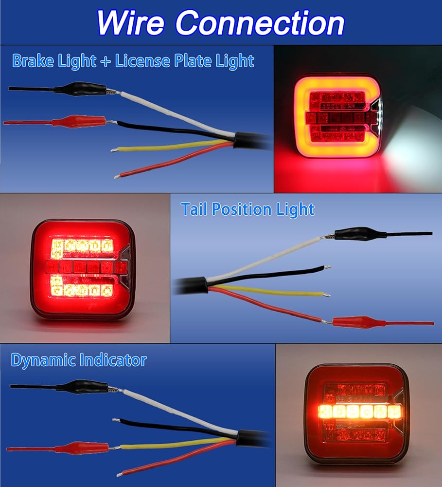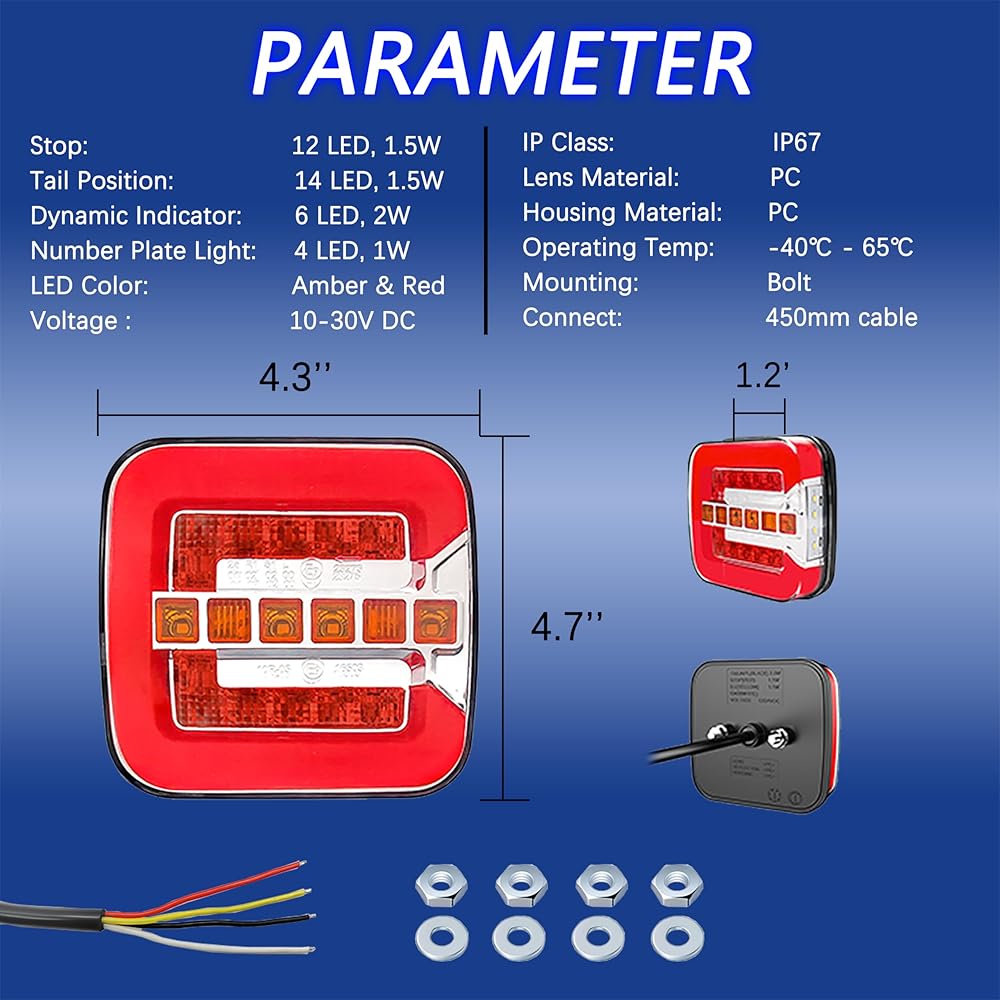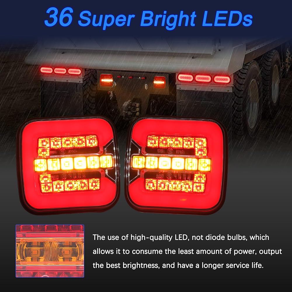 【إضاءة مقطورة متعددة الوظائف】: 2 عبوة من مصابيح خلفية LED للمقطورة مع 4 وظائف: ضوء موضع الذيل/إيقاف/مؤشر ديناميكي/إضاءة لوحة الأرقام الجانبية. ولكل من مصابيح المقطورة اليسرى واليمنى وظيفة إضافية واحدة: أضواء لوحة الترخيص. يمكن لوحدة واحدة القيام بالعديد من الوظائف بالكامل وتلبية جميع متطلبات الإضاءة الخلفية للمقطورات التي يقل عرضها عن 80 بوصة.