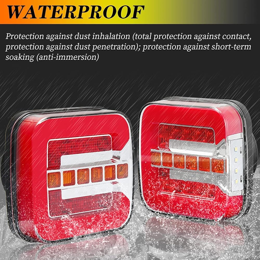 【IP67 مقاوم للماء】: يعتمد ضوء المقطورة على تقنية الختم الكامل للحام الصوتي لضمان إغلاق ضوء الذيل LED بإحكام. بالإضافة إلى هذه المزايا الرائعة، فإن عدسة المصباح الخلفي قوية للغاية ومقاومة للمواد الكيميائية والخدش. يمكن أن تعمل في الأيام الممطرة أو الأيام الضبابية أو الطقس الثلجي الكثيف.