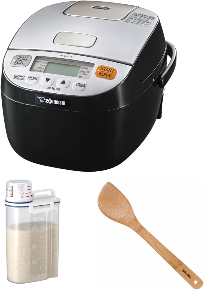 • Bundle Includes: Zojirushi Micom Rice Cooker and Warmer (3-Cup, Silver-Black), Rice Container Bin, and 15-Inch Bamboo Stir Fry Spatula