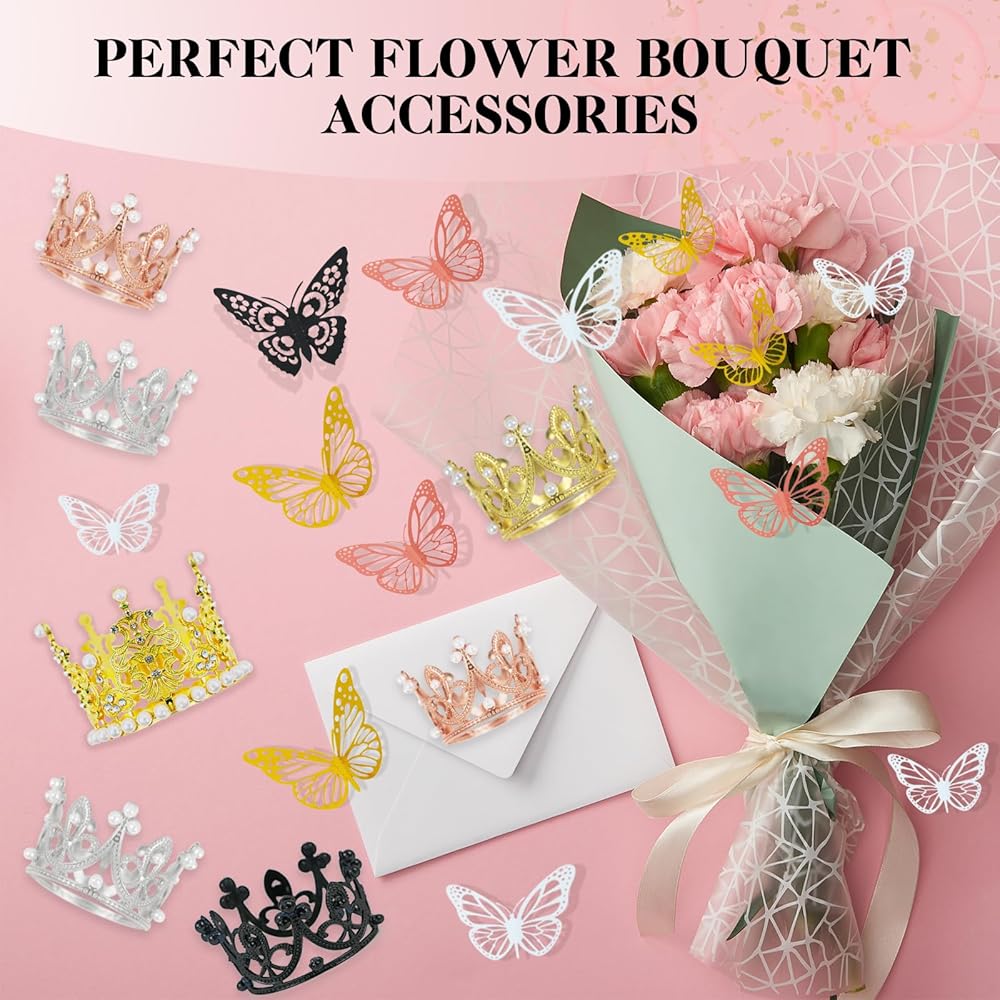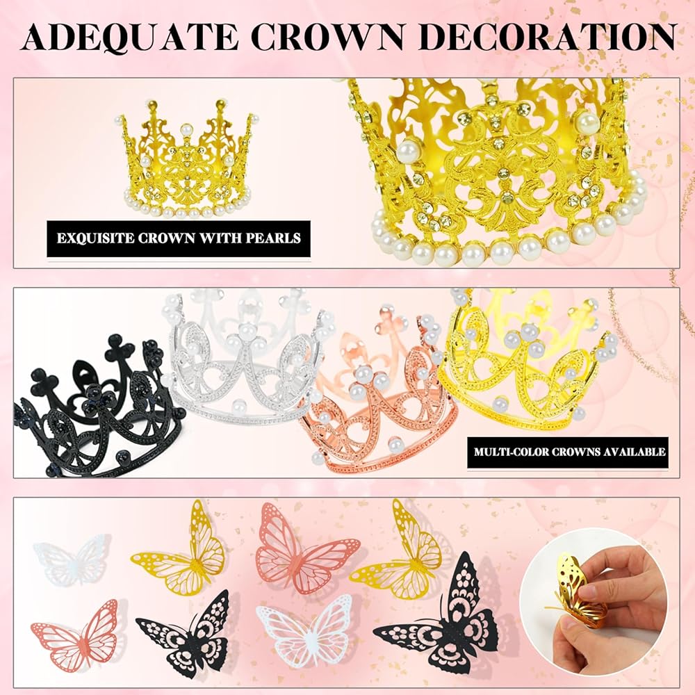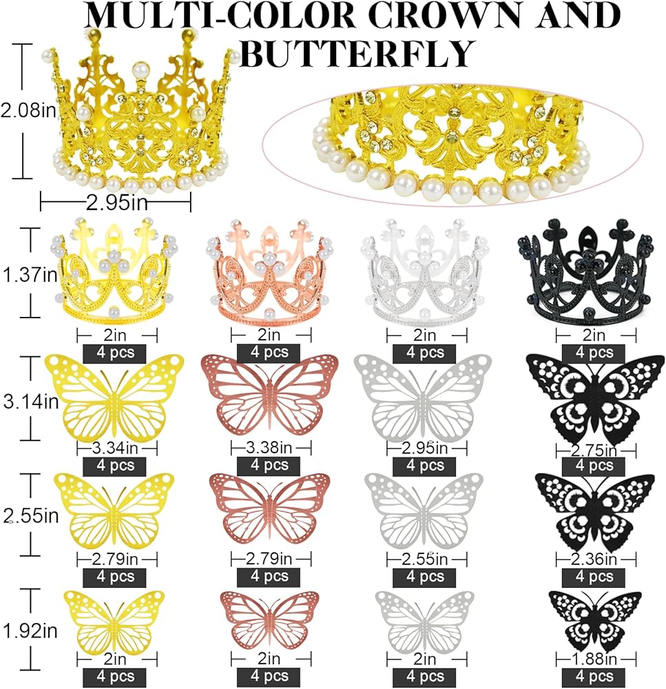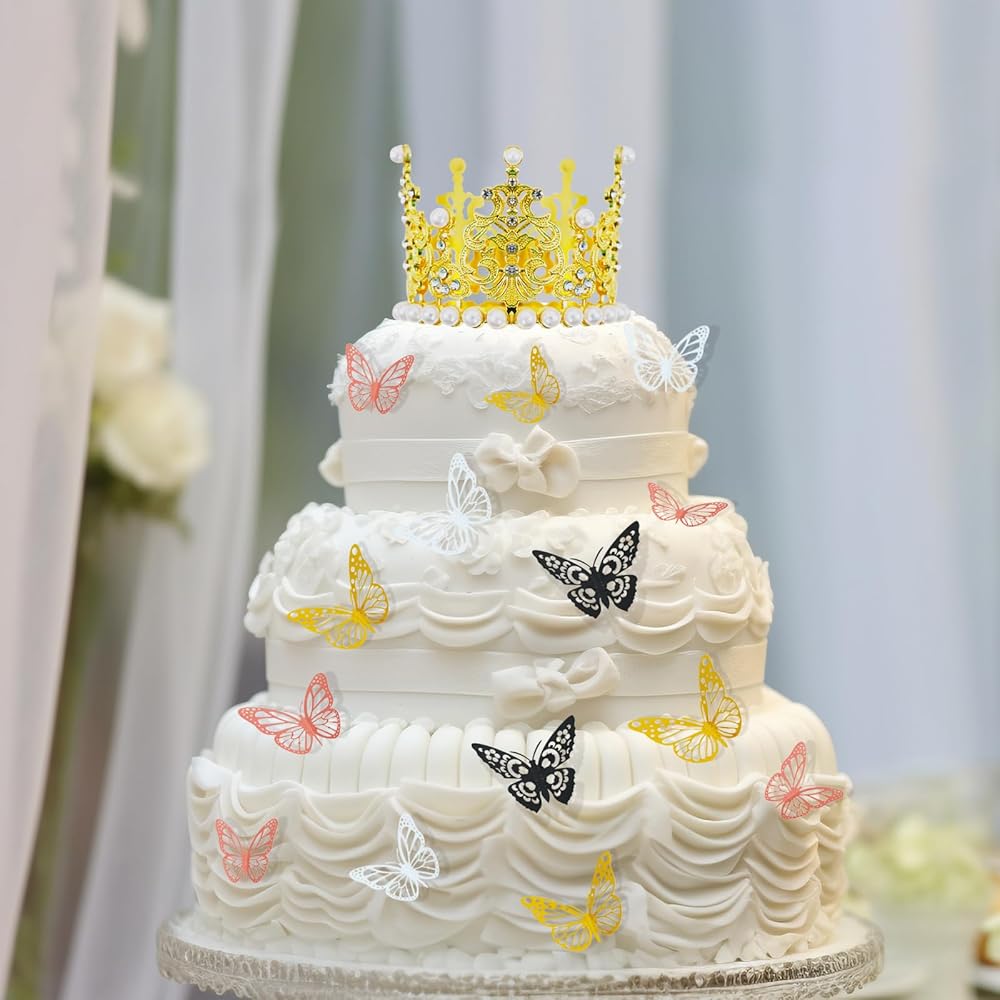 سوف تحصل على مجموعة من 12 قطعة تزيين للكعك مع التاج، و36 فراشة و100 دبوس ماسي، هذا التاج الذهبي مصنوع من مواد متينة، ويمكن للفراشات أن تعرض تأثيرًا ثلاثي الأبعاد أكثر واقعية، ويمكن أن تكون دبابيس الماس مثالية لزهرة الباقة الخاصة بك.