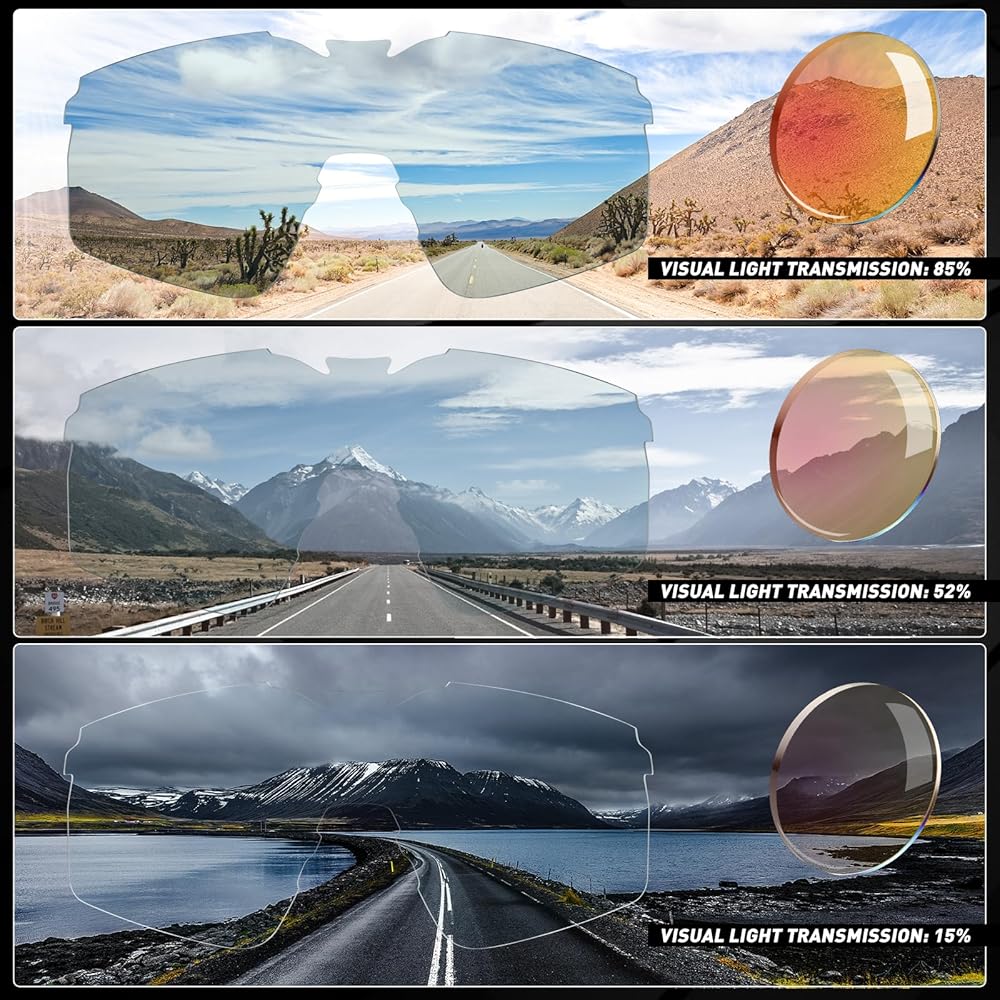 【نظارات فوتوكروميك】تصبح النظارات الشمسية الفوتوكرومية داكنة وسطوع وفقًا لظروف الإضاءة، وتتغير من اللون الشفاف إلى الأسود في ضوء الشمس، مما يحمي عينيك بشكل فعال مع توفير تجربة مشاهدة مريحة.