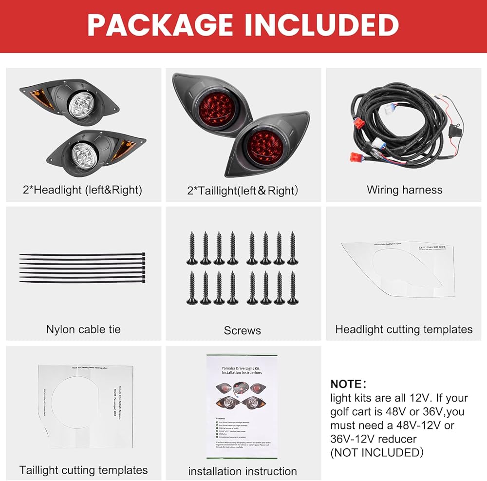 [سهلة التركيب] - تشتمل المصابيح الأمامية لعربة الجولف Yamaha الخاصة بنا على تعليمات مفصلة، مما يجعل من السهل عليك تركيبها (وقت التثبيت المقدر حوالي 2-3 ساعات). يرجى ملاحظة: إذا كانت عربة الجولف الخاصة بك 48 فولت أو 36 فولت، فستحتاج إلى مخفض جهد 48 فولت-12 فولت أو 36 فولت-12 فولت (مخفض الجهد غير متضمن).