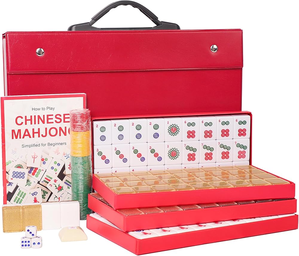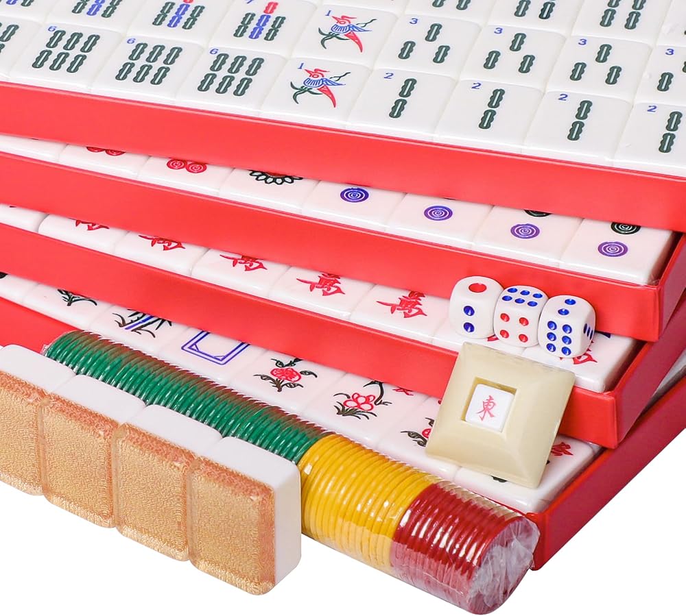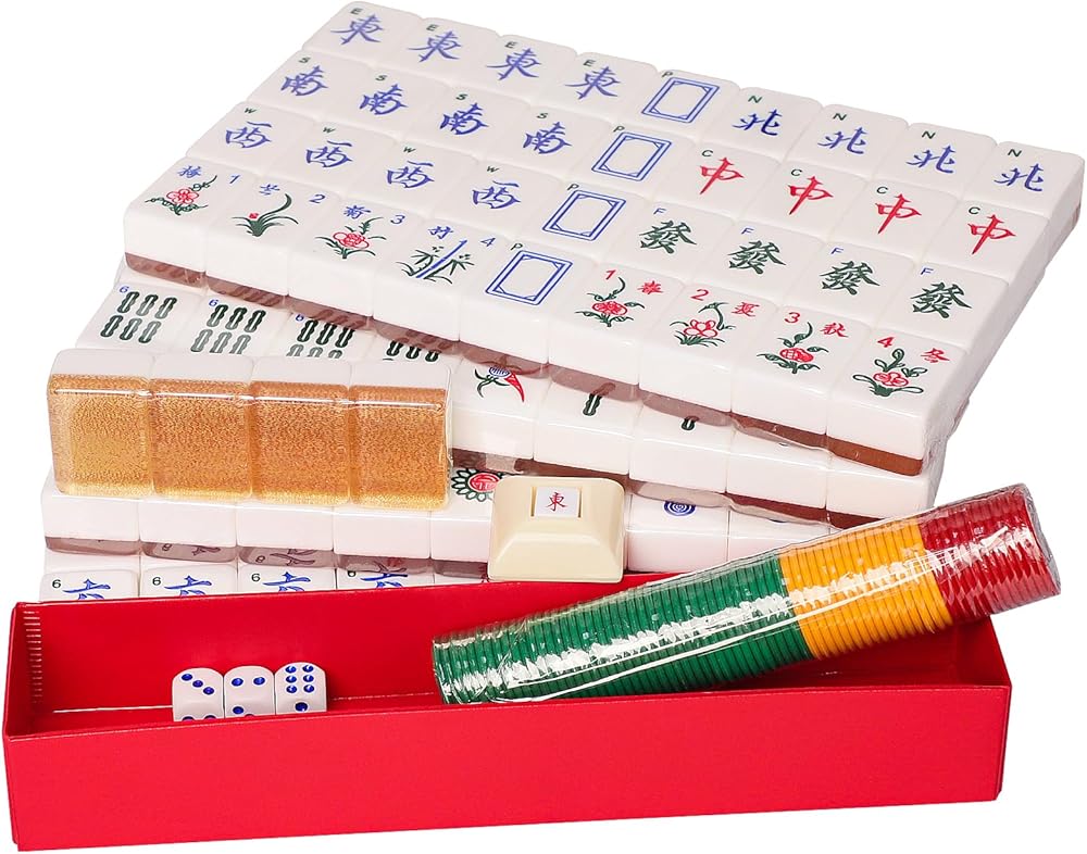 تشتمل العبوة على: مجموعة Mah-Jongg الصينية الكاملة تتضمن 144 بلاطة أكريليك مرقمة بلون خلفي جميل (36 دائرة، 36 خيزران، 36 شخصية، 12 تنين، 16 رياح (N، E، S، W)، 8 زهور ومواسم)، أيضًا 4 قطع احتياطية، 3 نرد، مؤشر الرهان/الرياح، مجموعة من الرقائق الملونة (تتضمن التعليمات الإنجليزية)
