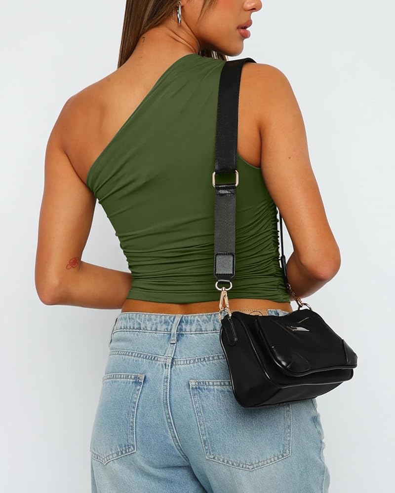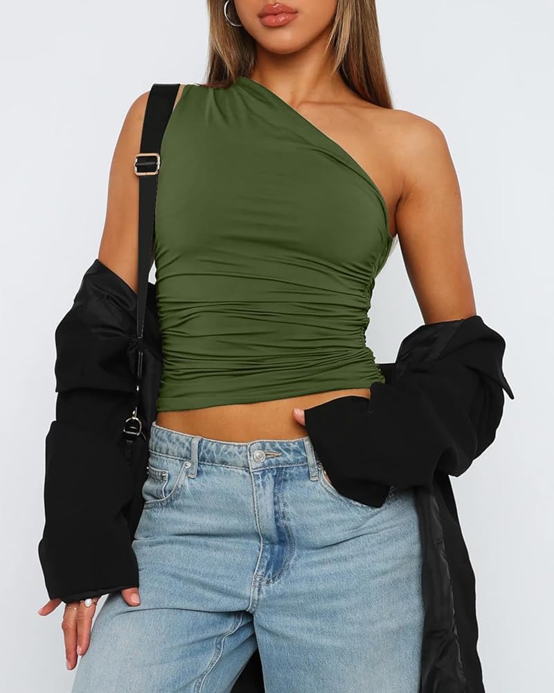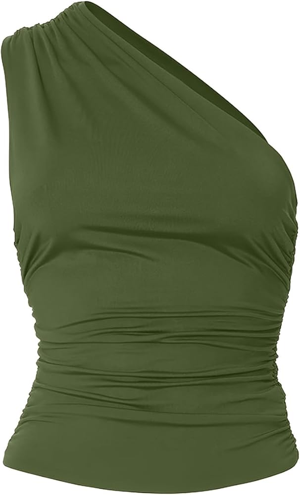 النمط: كتف واحد، بدون أكمام، تفاصيل جانبية مكشكشة، بدون ظهر، لون ثابت، تي شيرتات بمقاس نحيف، قمصان Y2K للخروج، قمصان قصيرة عصرية أساسية