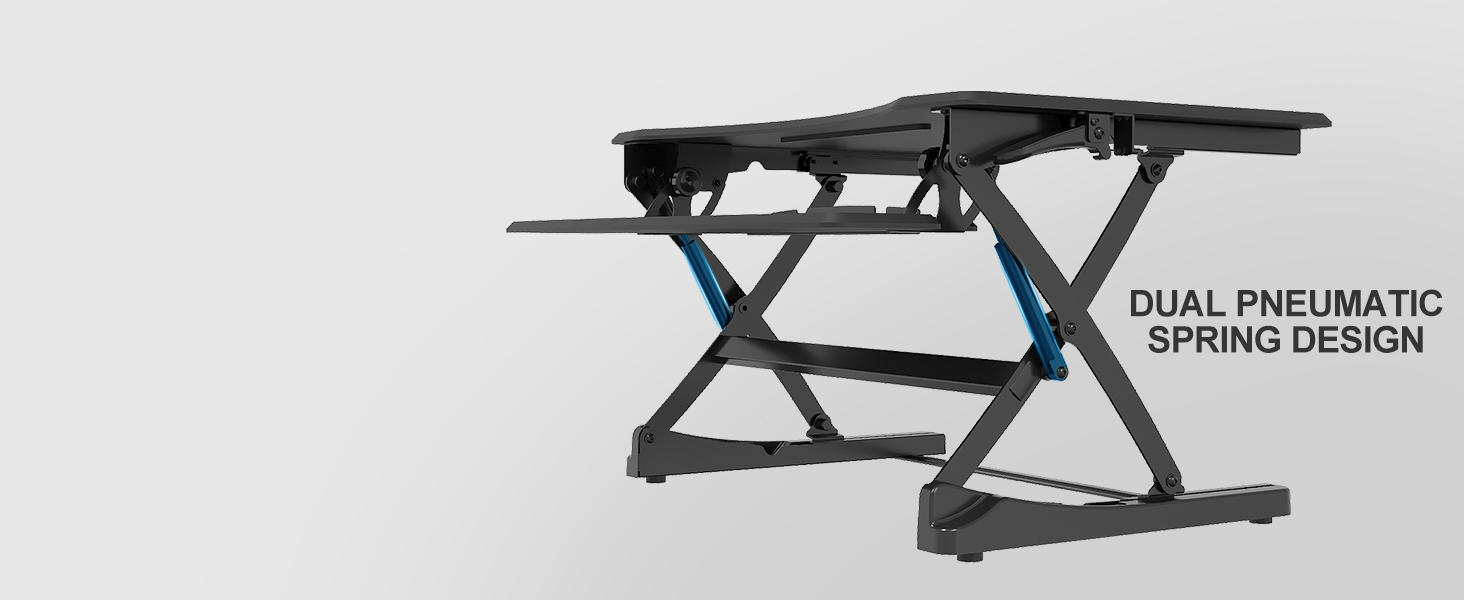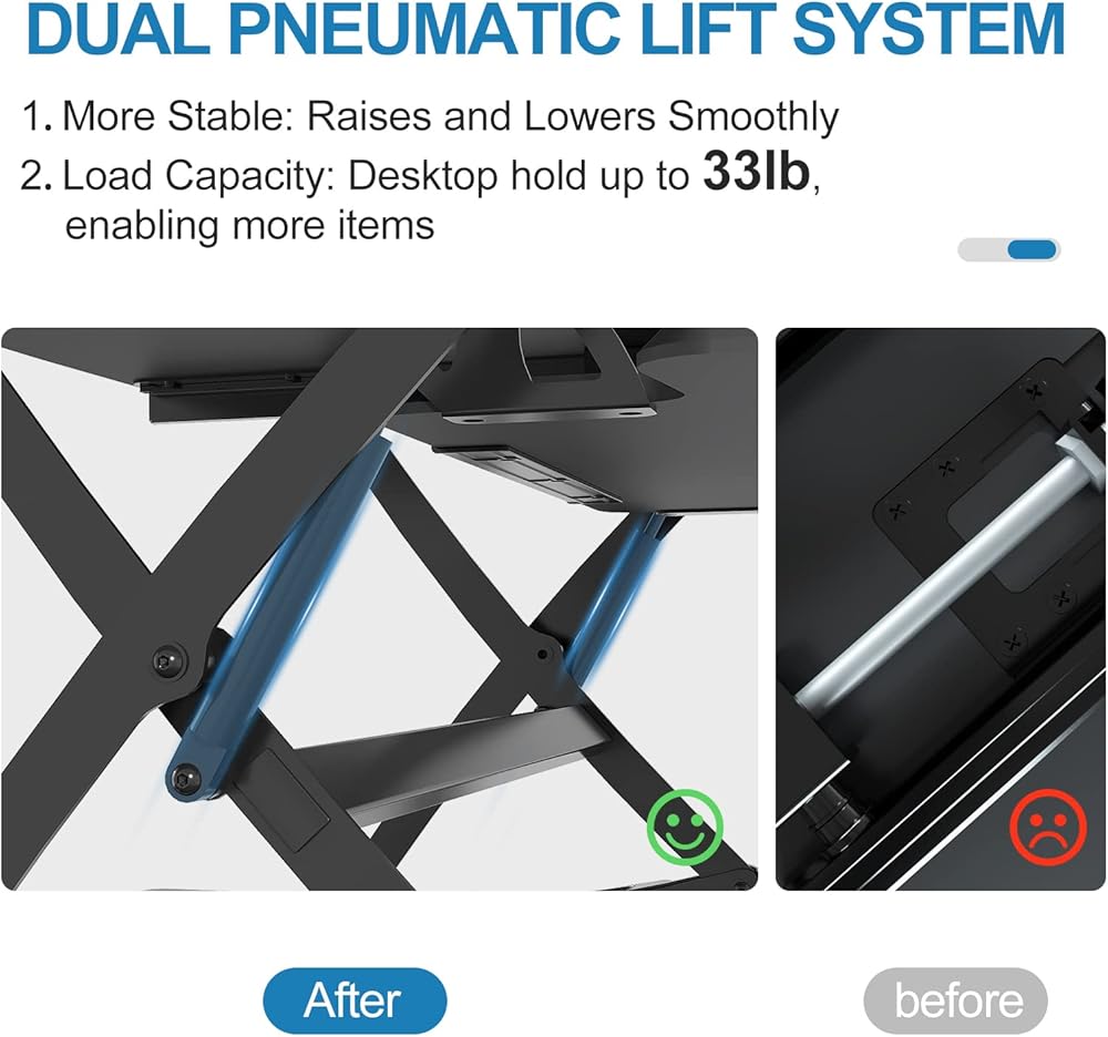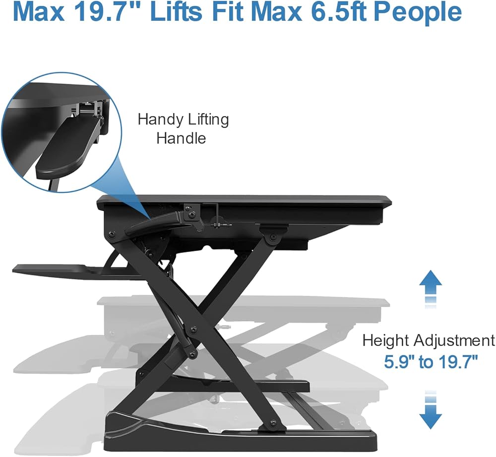 نظام رفع هوائي مزدوج: يتم تشغيل محول المكتب القائم القابل للتعديل الخاص بنا بواسطة نوابض غاز هوائية مزدوجة تتيح تعديل الارتفاع بسلاسة وسهولة على جميع الارتفاعات التي تريدها. يرتفع حتى 19.7 بوصة وينخفض إلى 5.9 بوصة مما يجعله مثاليًا لك بغض النظر عن طولك