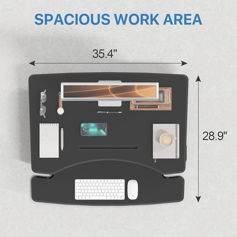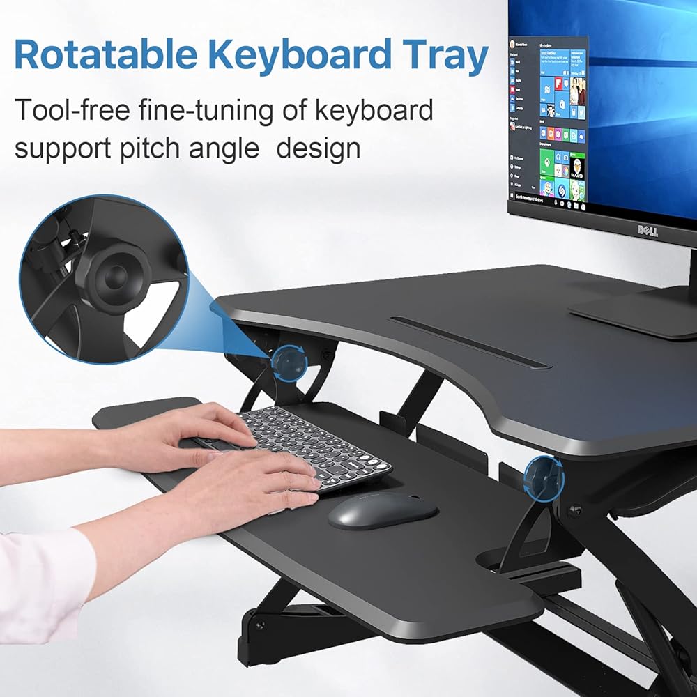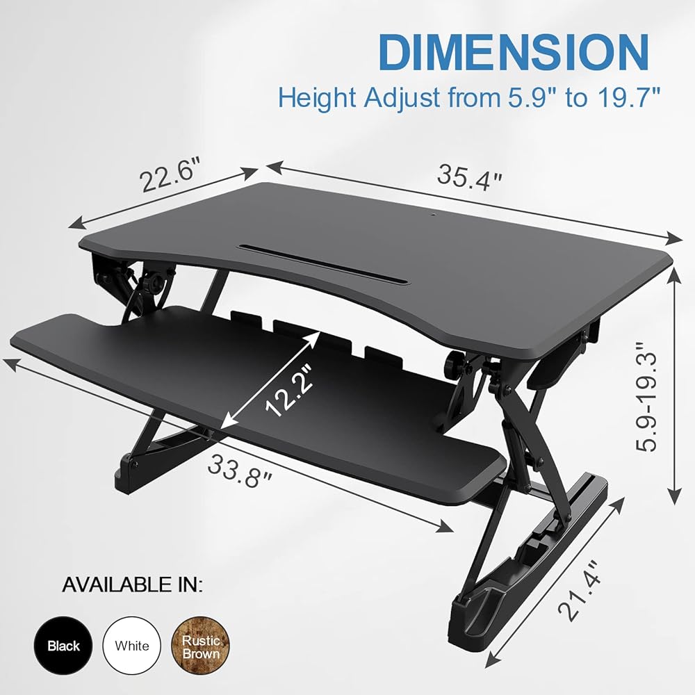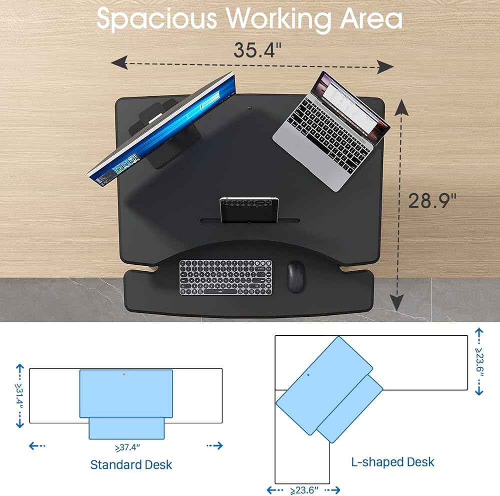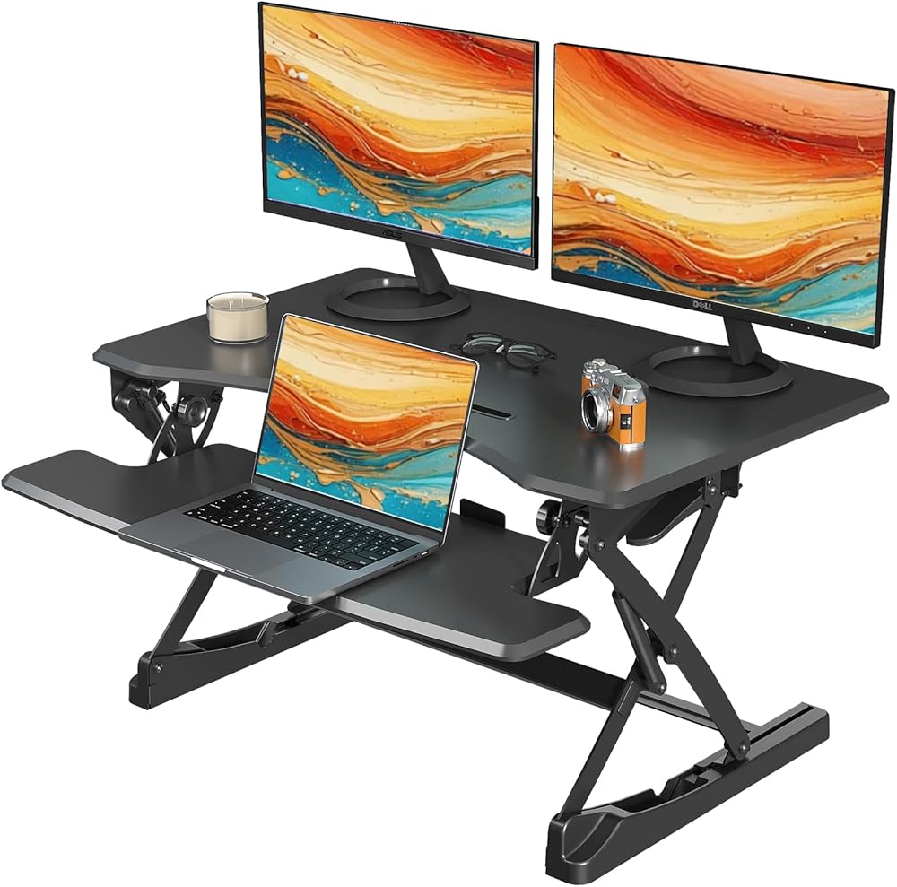 محول مكتب قائم من Joy Seeker بارتفاع 35 بوصة وقابل للتعديل للجلوس والوقوف على سطح المكتب مع نوابض غازية مزدوجة مع صينية لوحة مفاتيح واسعة لأجهزة الكمبيوتر المحمولة ومحطة عمل مزدوجة للشاشة، أسود