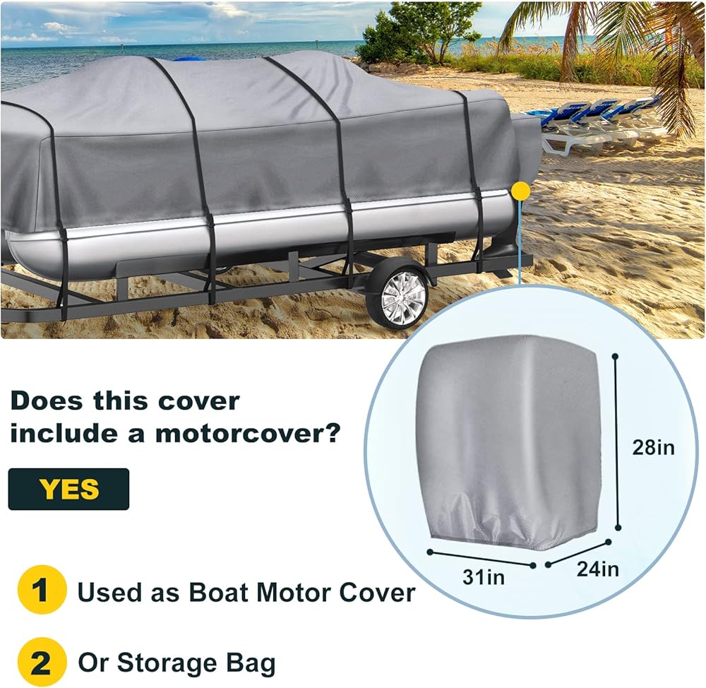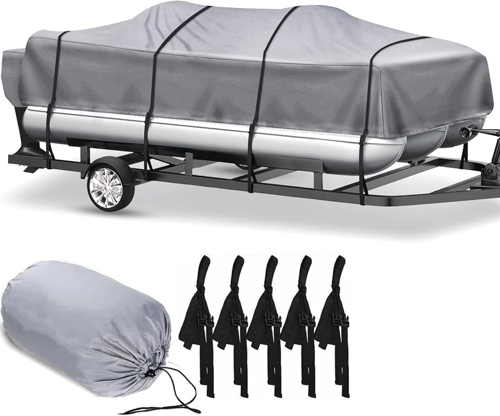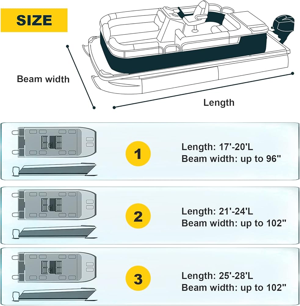 • UPGRADED WINDPROOF DESIGN:upgraded 12 high density Oxford ribbons(2 stern straps with hook ) and the buckles made of high quality plastic instead,secure the cover to the Pontoon Boat more securely. Easy towing and avoid tearing on the way, integrated buckle and adjusable strap tightening system provides easy installation and quick release