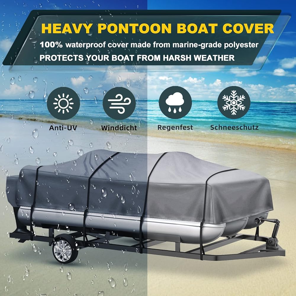 • HEAVY DUTY PONTOON BOAT COVER: Made of 600 Denier PU coated Marine Grade waterproof, tear resistant, U.V resistant Polyester,600D is way heavier canvas than 500D /420D /300D/210D; Double stitching, bow is double reinforced; Anti-UV ability increased by 40%, avoid aging, disintegration and tearing due to exposure to the sun
