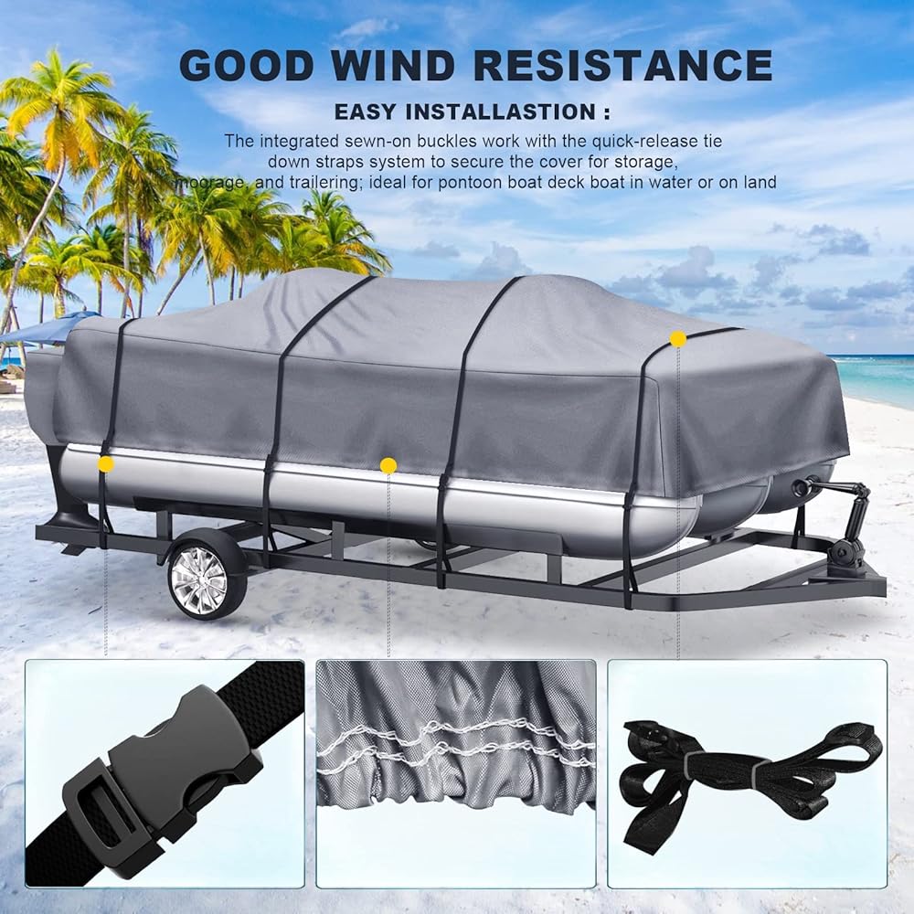• EASY INSTALLASTION : The integrated sewn-on buckles work with the quick-release tie down straps system to secure the cover for storage, moorage, and trailering; ideal for pontoon boat deck boat in water or on land