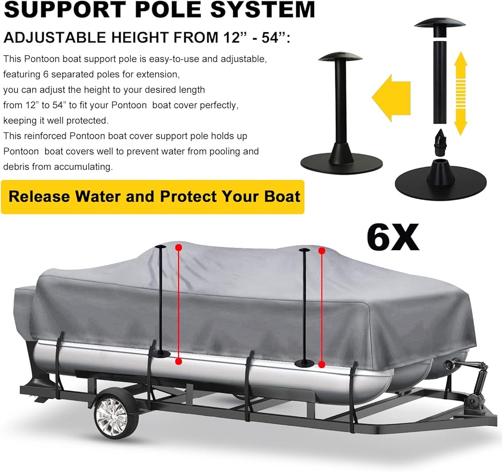 • ADJUSTABLE HEIGHT FROM 12" - 54": This Pontoon boat support pole is easy-to-use and adjustable, featuring 6 separated poles for extension, you can adjust the height to your desired length from 12" to 54" to fit your Pontoon boat cover perfectly, keeping it well protected. This reinforced Pontoon boat cover support pole holds up Pontoon boat covers well to prevent water from pooling and debris from accumulating.