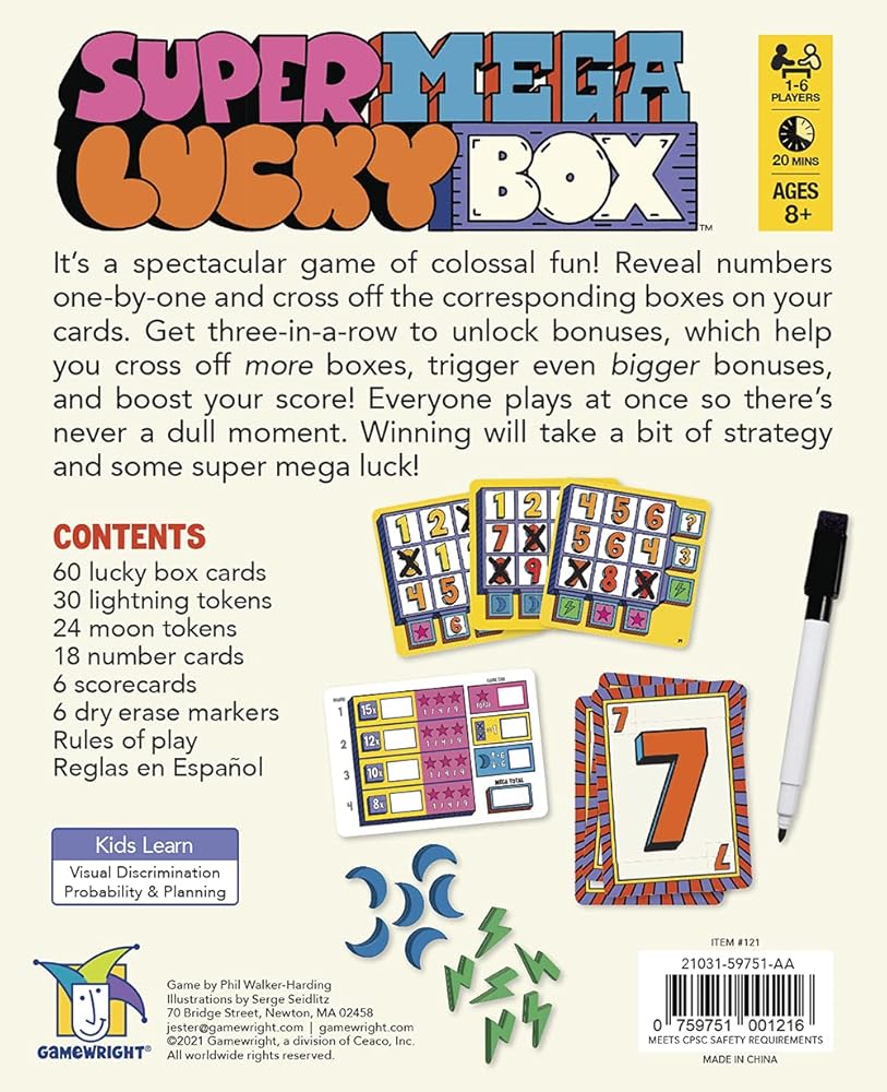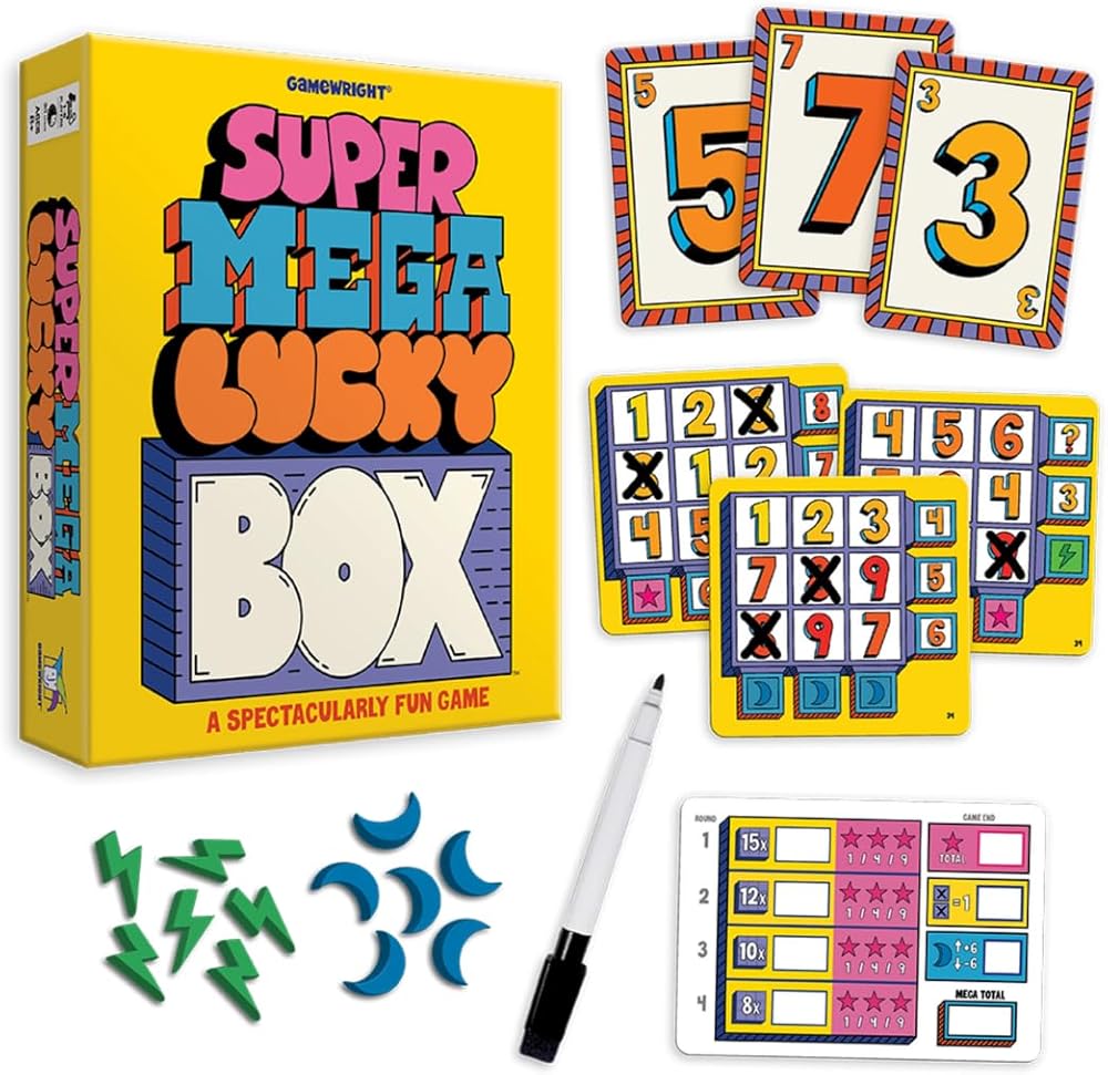 Box Contents: (60) Lucky Box Cards, (30) Lightning Tokens, (24) Moon Tokens, (18) Number Cards (Two Sets of 1-9), (6) Super Mega Scorecards, (6) Dry Erase Markers, (1) Lucky Box Card Guide