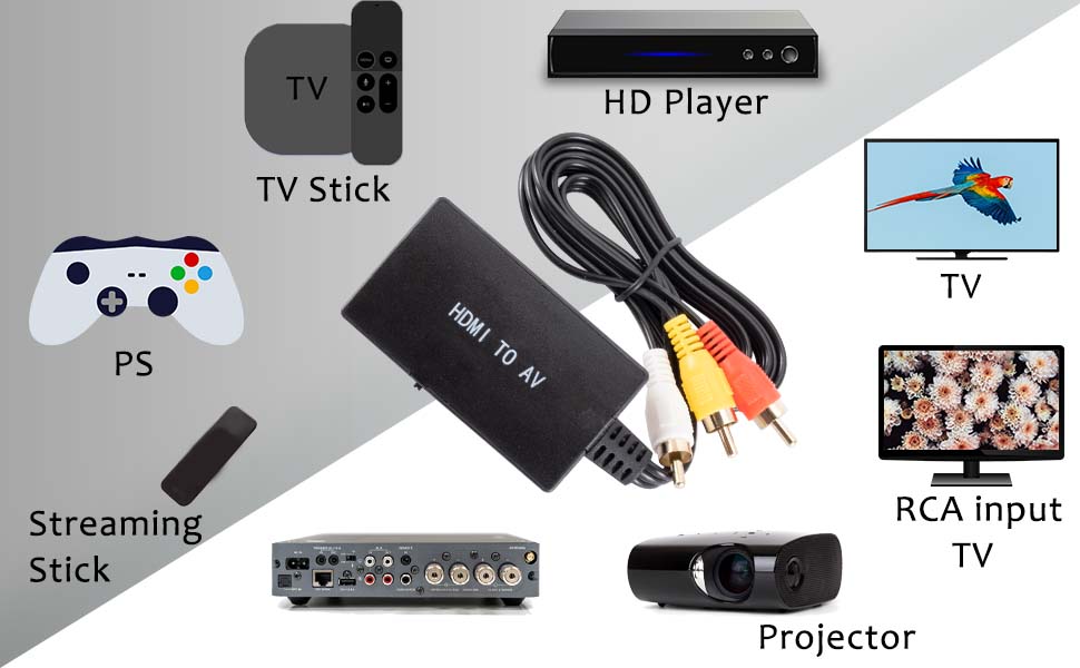 يستخدم على نطاق واسع - محول HDMI إلى RCA للتلفزيون المتوافق مع PS3 وDVD وPC وBlue-Ray وXbox One وXbox 360 وRoku وChromecast وRoku وFirestick وApple TV وغيرها من صناديق الوسائط المتدفقة. يدعم الإخراج أجهزة التلفاز القديمة والشاشة وجهاز العرض.