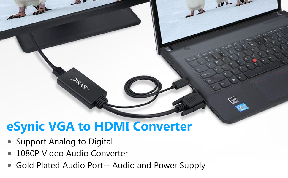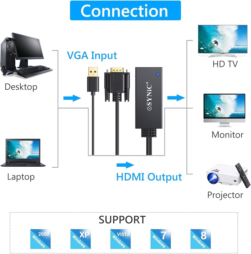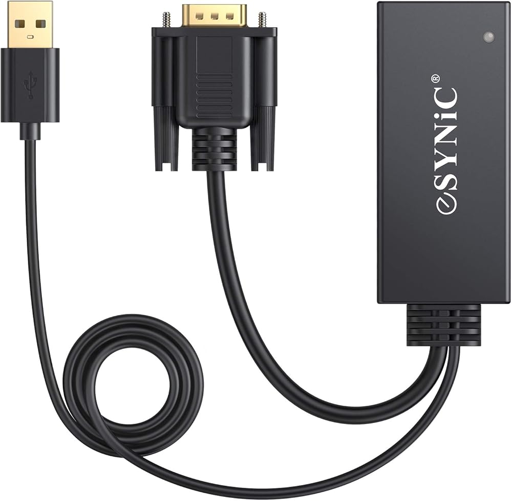 محول eSynic VGA إلى HDMI، موصلات مطلية بالذهب، يدعم دقة 1080 بكسل، تركيب سهل التوصيل والتشغيل