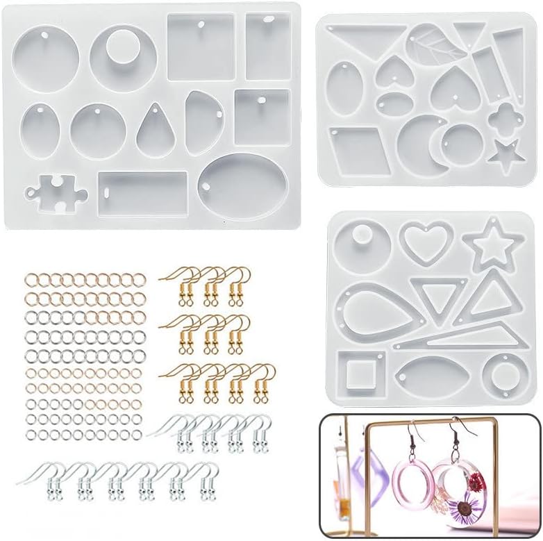 【143 Pieces Resin Silicone Moulds】 Comes with 3 epoxy resin molds with 36 different shapes including geometric shapes, heart, leaf, moon and puzzle. Comes with 20pcs gold hooks, 20pcs silver hooks, 25pcs 5mm gold open jump rings, 25pcs 5mm silver open jump rings, 25pcs 8mm gold jump rings and 25pcs 8mm silver open jump rings.
