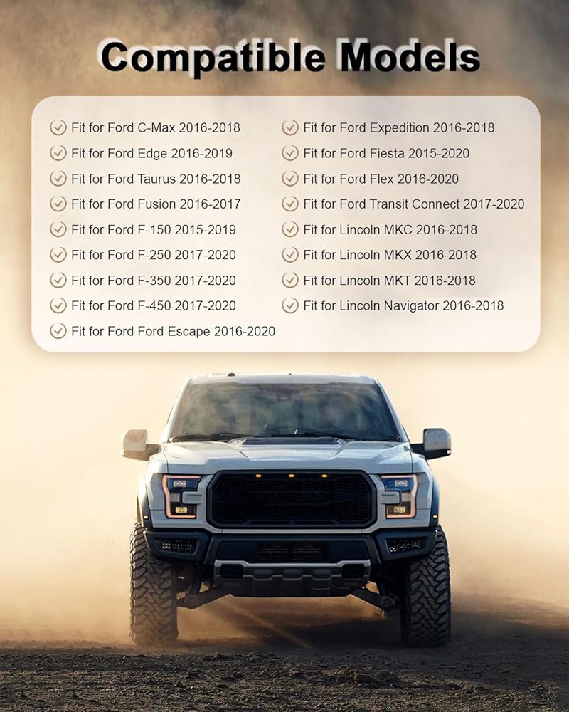Compatible Models: Compatible with Ford C-Max 2016-2018/Edge 2016-2019/Taurus 2016-2018/Fusion 2016-2017/F-150 2015-2019/F-250 2017-2020/F-350 2017-2020/F-450 2017-2020/ Ford Escape 2016-2020/Expedition 2016-2018/Fiesta 2015-2020/Flex 2016-2020/Transit Connect 2017-2020/ Lincoln MKC/MKX/MKT/Navigator 2016-2018