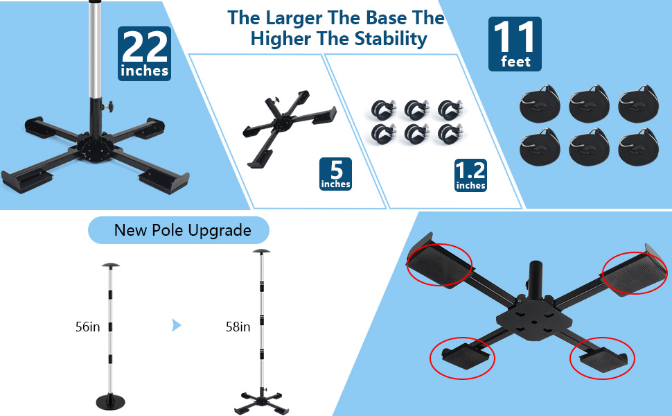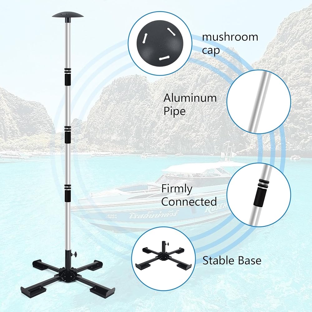 【تصميم الثبات】تتكون أعمدة دعم غطاء القارب العائم من غطاء فطر مقاس 5 بوصات وقاعدة حديدية شديدة التحمل مضادة للانزلاق مقاس 22 بوصة، من أجل تحمل الرياح القوية بشكل أفضل. يعتبر عمود دعم غطاء القارب المزود بدعامة حديدية أكثر استقرارًا من أعمدة دعم القارب الأخرى. يتميز الغطاء بثلاثة فتحات يمكن أن تسمح لأعمدة دعم غطاء القارب بأشرطة لتوفير حماية أقوى.