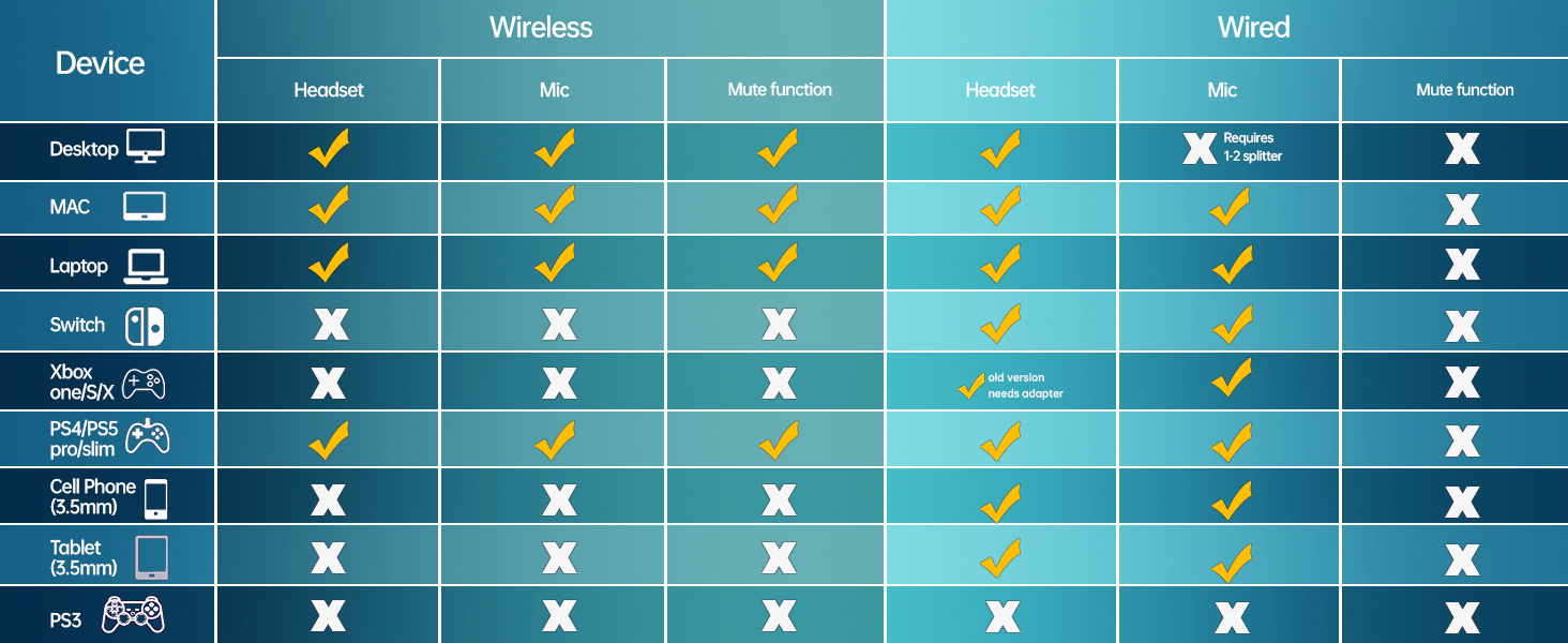 • اتصال لاسلكي 2.4 جيجا هرتز ووضع سلكي - يمكن أن تكون سماعة الرأس اللاسلكية TA83 متوافقة تمامًا مع أجهزة الكمبيوتر الشخصية وأجهزة PS4 وPS5 والكمبيوتر المحمول وأجهزة Mac. ويرجى ملاحظة أنه إذا كنت تريد توصيل سماعة الرأس بأجهزة Xbox، فأنت بحاجة إلى توصيل كابل 3.5 ملم بسماعة الرأس، ويمكن أن يكون الوضع السلكي فقط متوافقًا مع Xbox one أو Xbox Series أو Nintendo Switch أو الهواتف المحمولة أو أي أجهزة مع منفذ 3.5 ملم. تحتوي سماعة الرأس أيضًا على وضع Bluetooth لدعم الأجهزة التي تحصل على وظيفة BT.