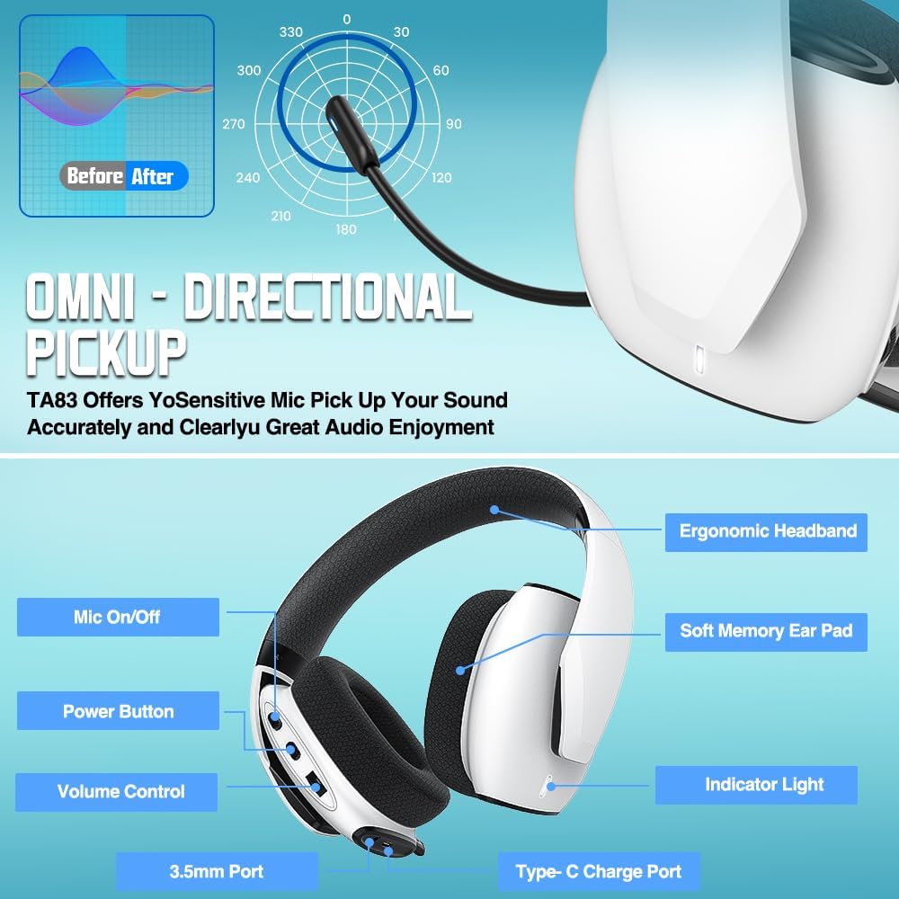 سماعة ألعاب لاسلكية BENGOO TA83 لجهاز PS5 PS4 PC، سماعات رأس بلوتوث 2.4G USB للألعاب مع ميكروفون لإلغاء الضوضاء لمفتاح كمبيوتر Mac المحمول