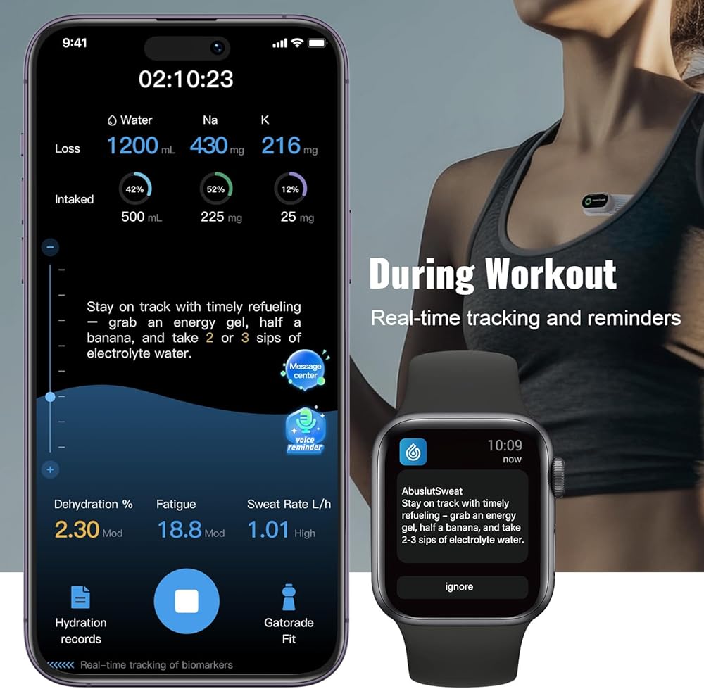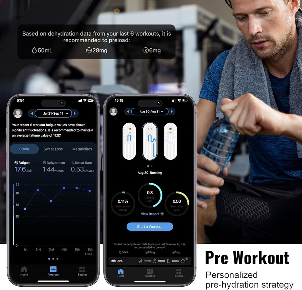 Energy Replenishment Reminder: We can receive timely reminders for hydration through the phone, headphones, or watch, and follow the prompts to replenish fluids or energy. During the workout, we need to ensure that there is a sufficient amount of sweating, and the sweat has filled the sweat collection channels in our patches