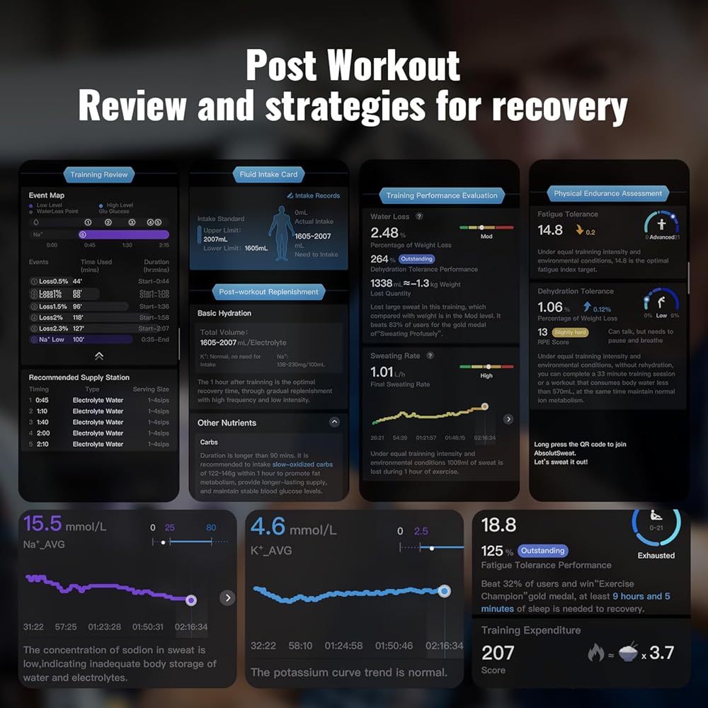 Workout Report: It will generates a detailed report, including sweat component data and recommendations for hydration and supplements in future sessions. It also provides nutritional advice for the 24 hours after workout and assesses the athlete's physical condition and fatigue level. After the user accumulates data from 6 sessions, we will conduct an overall analysis of the workout data which will make personalized exercise recommendations based on your body's metabolism to enhance tolerance