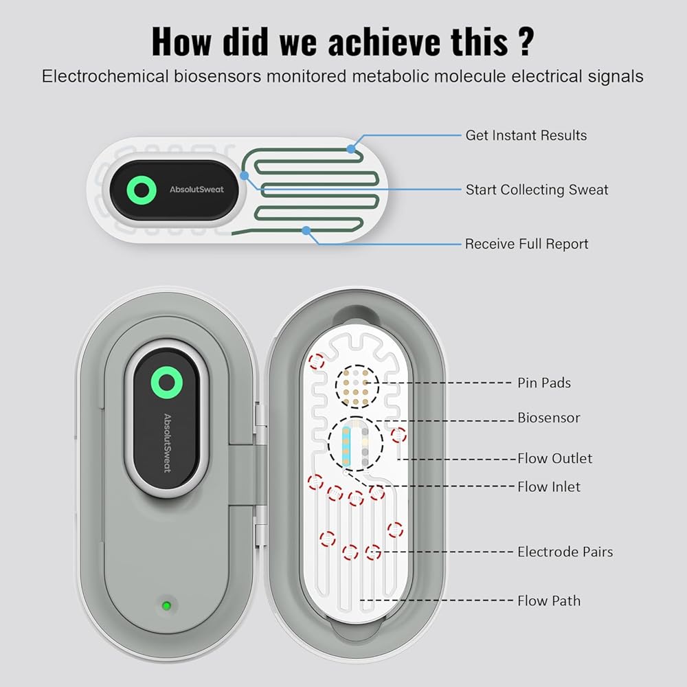 How To Use: You can obtain the free application on the Apple App Store and Android store.After downloading the app, you need to pair it with your phone and assemble the device with the sweat-testing patches. Assembly should be done following our instructions. Ensure that the metal pointers of the device perfectly align with the patches, we recommend placing the product on the chest. It come with 12 sweat patches, which must be exchanged for new ones after each use and cannot be reused