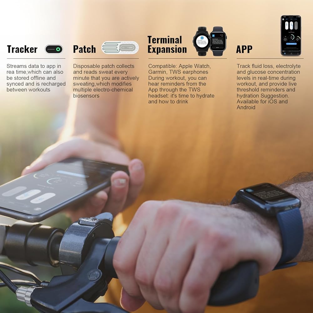 Your Scientific Physical Trainer: We often experience muscle soreness, dizziness and over fatigue during exercise, this is because our body loses metabolism of water, potassium, sodium,and sugar. By steady effort, we have developed an intelligent wearable sweat monitor device hydration tracker, which can monitor the consumption of metabolites in our sweat in real time, provide suggestions for systematic training and scientific supply, enhance our body's fatigue resistance and tolerance!