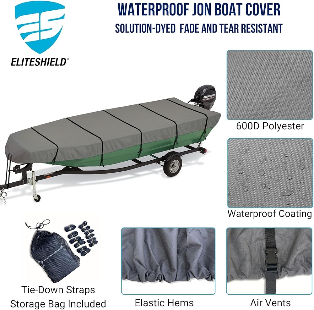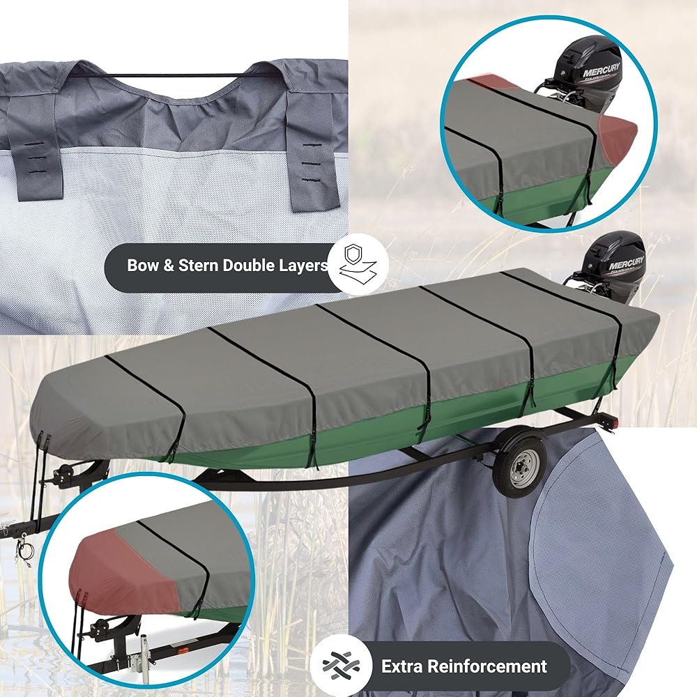 [Fade and Tear Resistant Fabric]: Made of heavy-duty 600D marine-grade solution-dyed polyester fabric with a UV-resistant composite, this anti-UV and tear-resistant material crafted with double-stitched interlock seams and rot-proof thread further guarantee the durability and longevity of the boat cover; Provide maximum protection for your jon boat from sun, rain, dirt, pollutants, and other elements