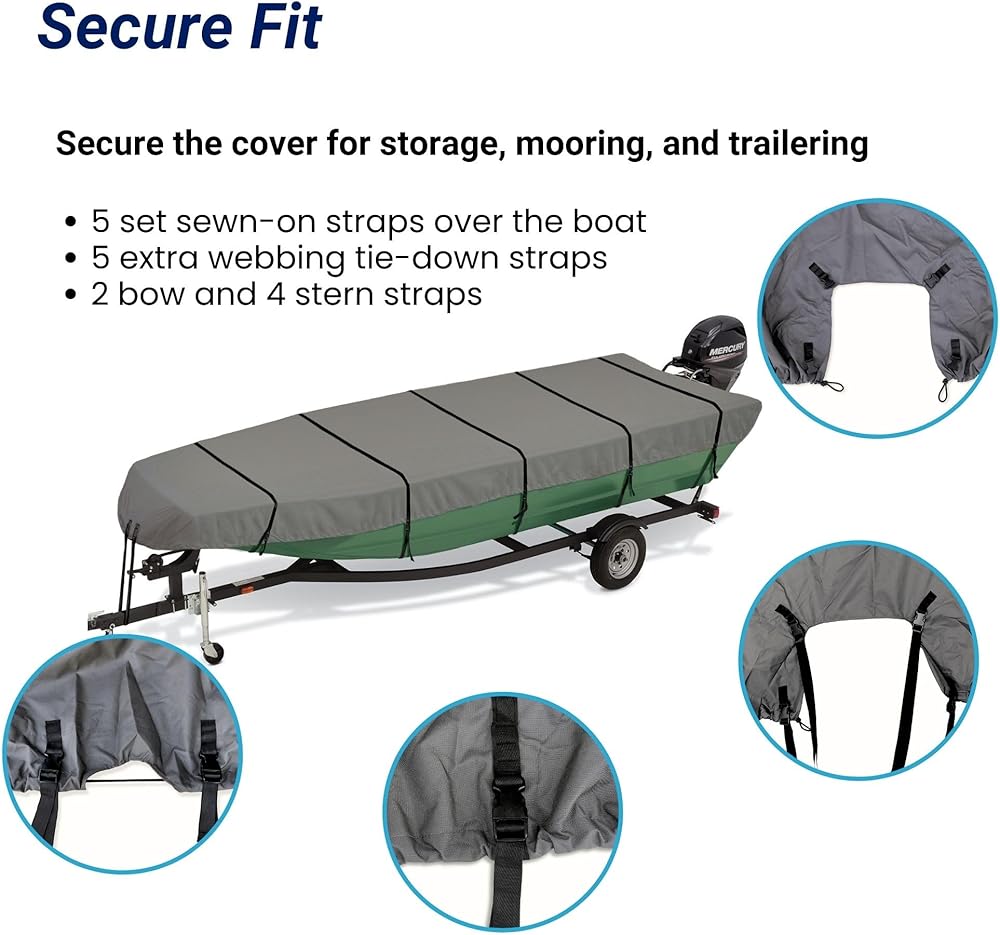 [Secure Fit]: The sewn-on straps over the boat ensure a secure fit, preventing water pooling; A full elastic cord around the cover's bottom offers a snug, custom-like fit; Additional webbing tie-down straps secure the cover for storage, mooring, and trailering