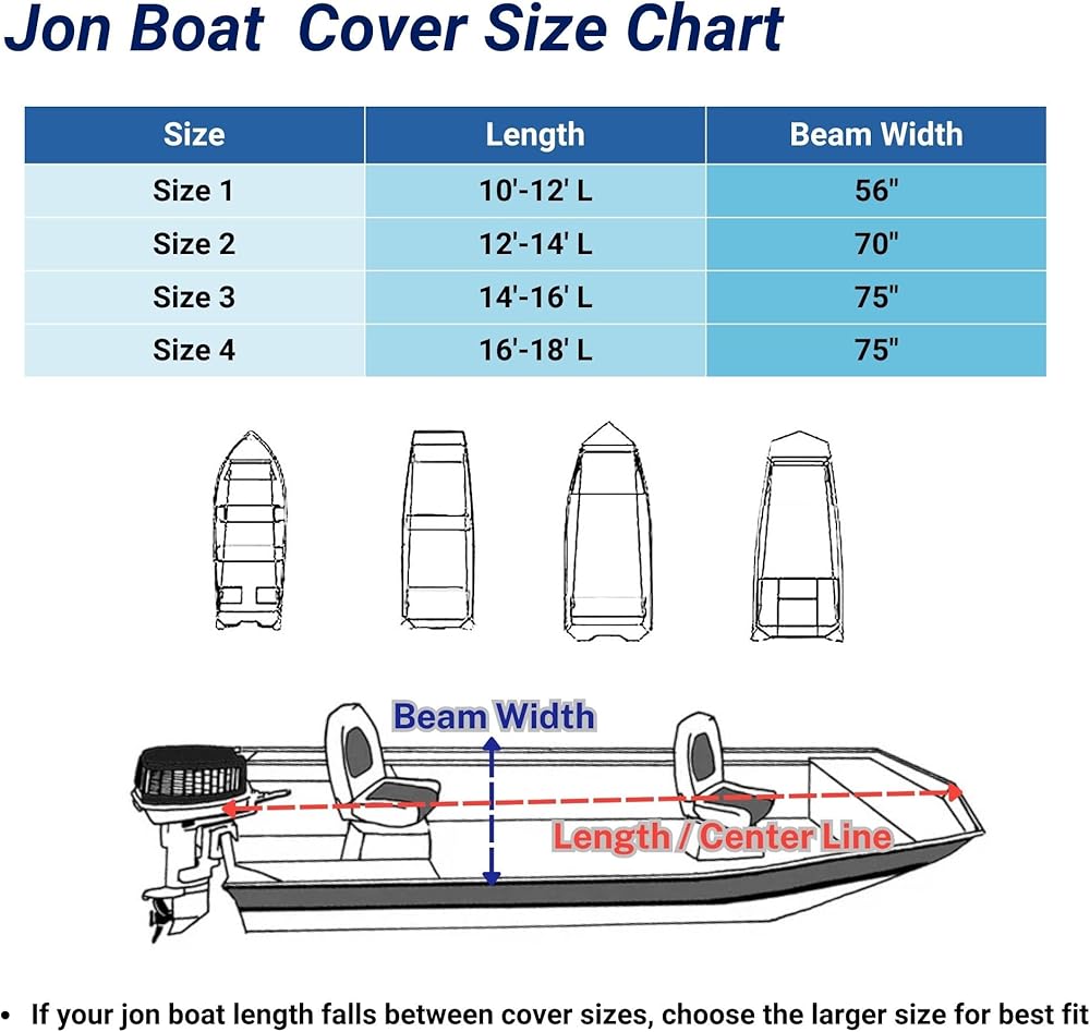 [Included Accessories]: Includes 5 webbing tie-down straps, 2 bow and 4 stern straps, and a mesh storage bag for cover storage; Backed by a two-year warranty against material defects or workmanship; If your jon boat length falls between cover sizes, choose the larger size for best fit