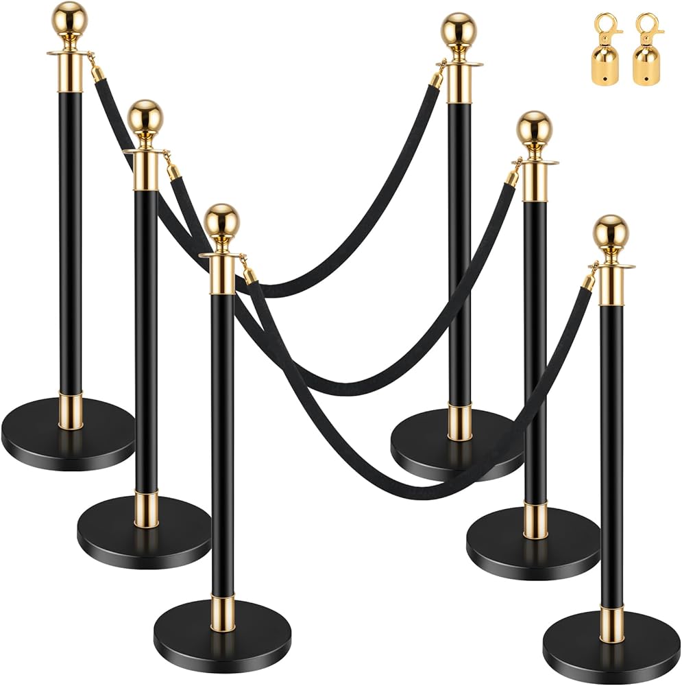 دعامات التحكم في الحشود الذهبية، مجموعة دعامات حبل مخملية حمراء، عمود قائمة انتظار مع حبل مخملي أحمر بطول 5 أقدام/1.5 متر - دعامات وحبال مخملية لمسرح الأفلام (38 بوصة، 6 قطع - أسود، ذهبي)