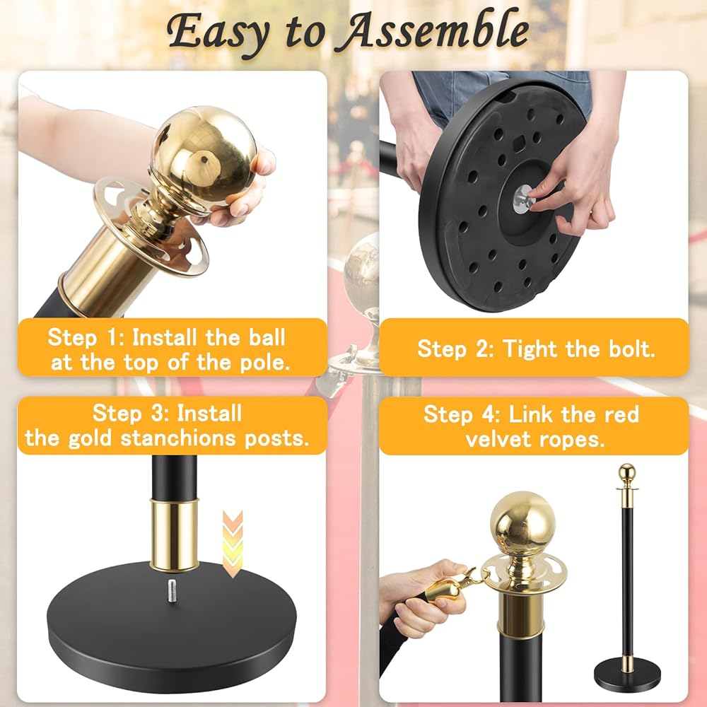 【Easy to Assemble】- You don't need to use other auxiliary tools, you can also assemble gold stanchions within a few minutes. Each rope has hooks at both ends to allow you to attach the rope to the stanchion posts easily and quickly. Step 1: Install the ball at the top of the pole. Step 2: Tight the bolt. Step 3: Install the gold stanchions posts. Step 4: Link the red velvet ropes.