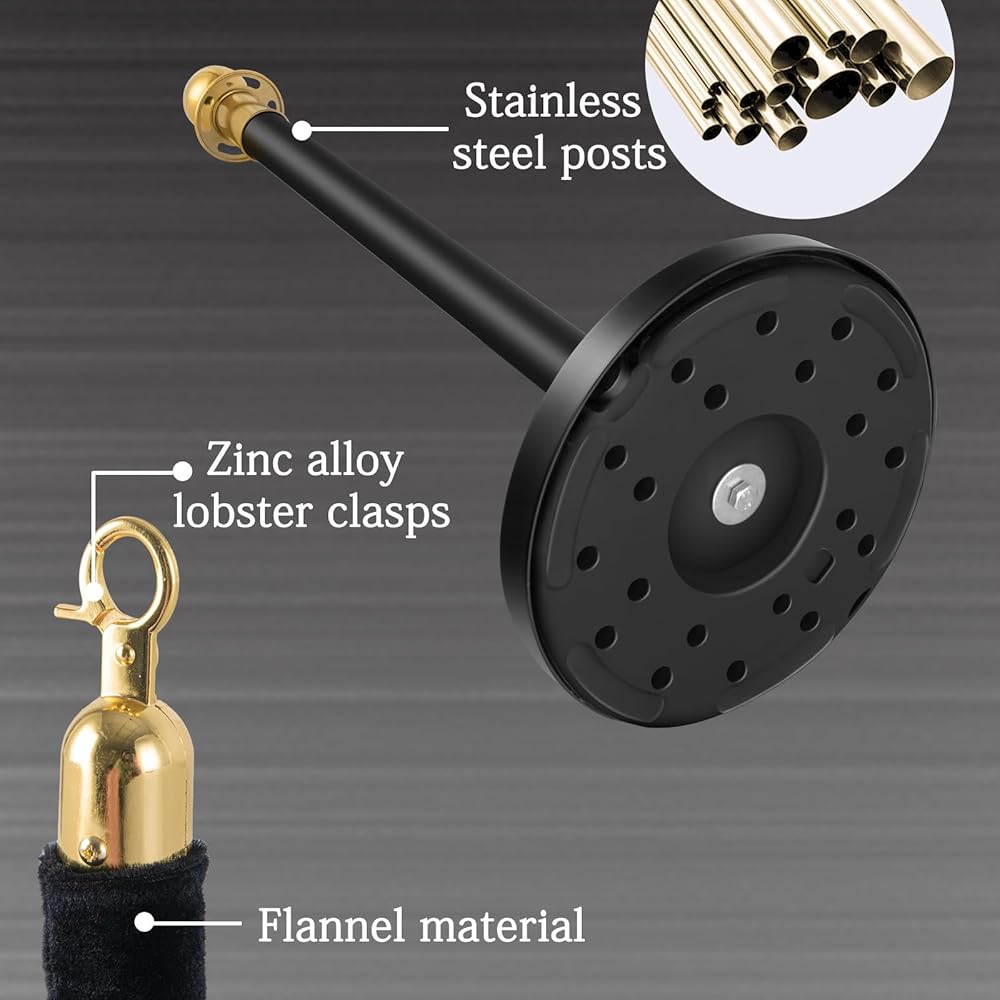 【Stanchions and Velvet Ropes】- The gold crowd control stanchions are constructed by stainless steel posts and zinc alloy lobster clasps, durable, and Waterproof, rust -proof, high temperature resistance, can adapt to indoor and outdoor, enough to use it for a long time; These velvet ropes are made of flannel material, not easy to break, and eye-catching. Red velvet rope with golden hooks makes for a perfect 5 foot spread between stanchions, providing a larger area for your various demands.
