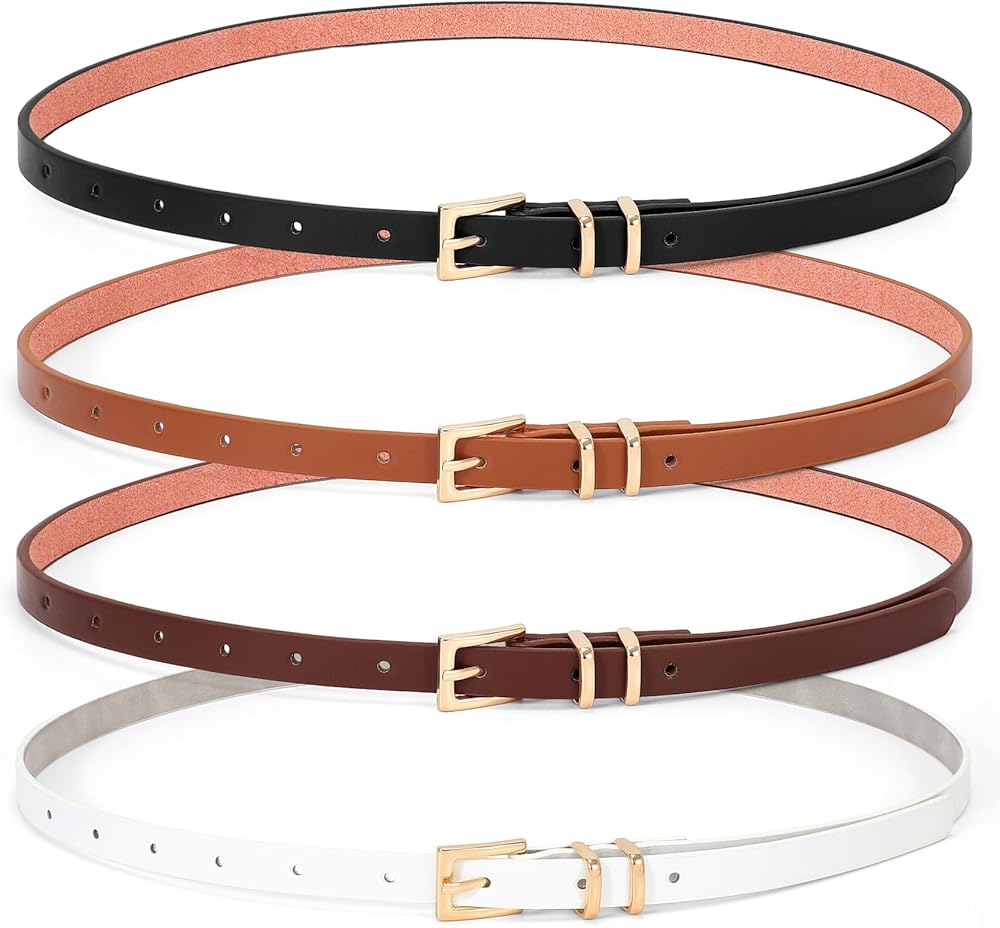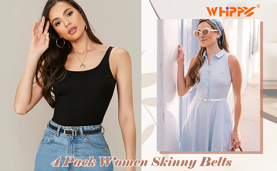 WHIPPY مجموعة من 4 حزام جلدي نحيف للسيدات، حزام خصر رفيع مع مشبك معدني لفساتين البنطلونات الجينز