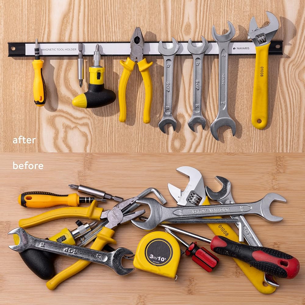 Save space in your garage or shed with Navaris' set of 3 powerful magnetic tool holderTOOL ORGANIZERIs your garage or workshop messy or untidy because of all your tools scattered around? The Navaris 18" magnetic tool bar is a great addition to any tool shop
