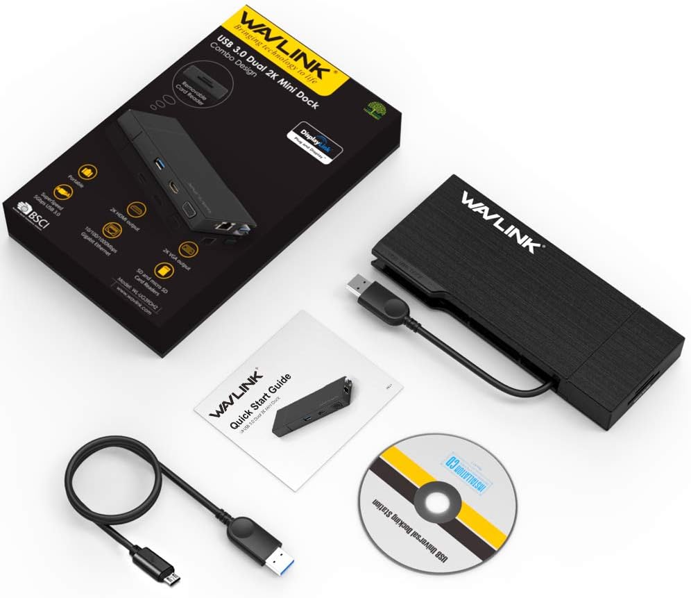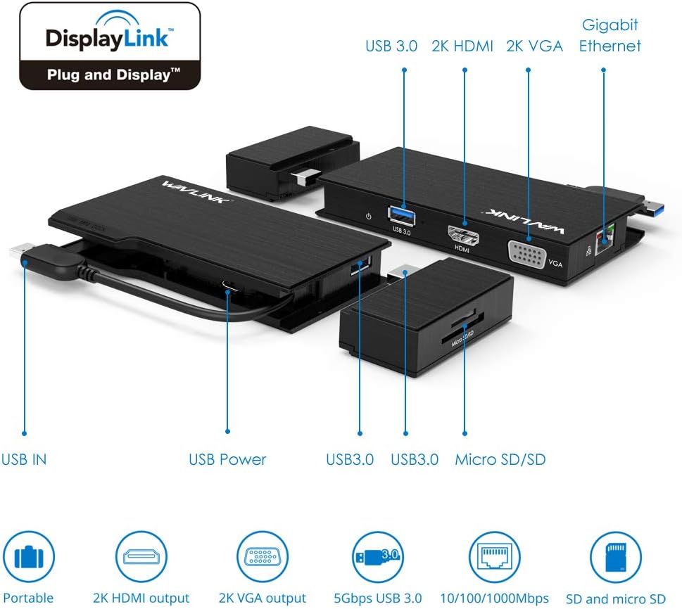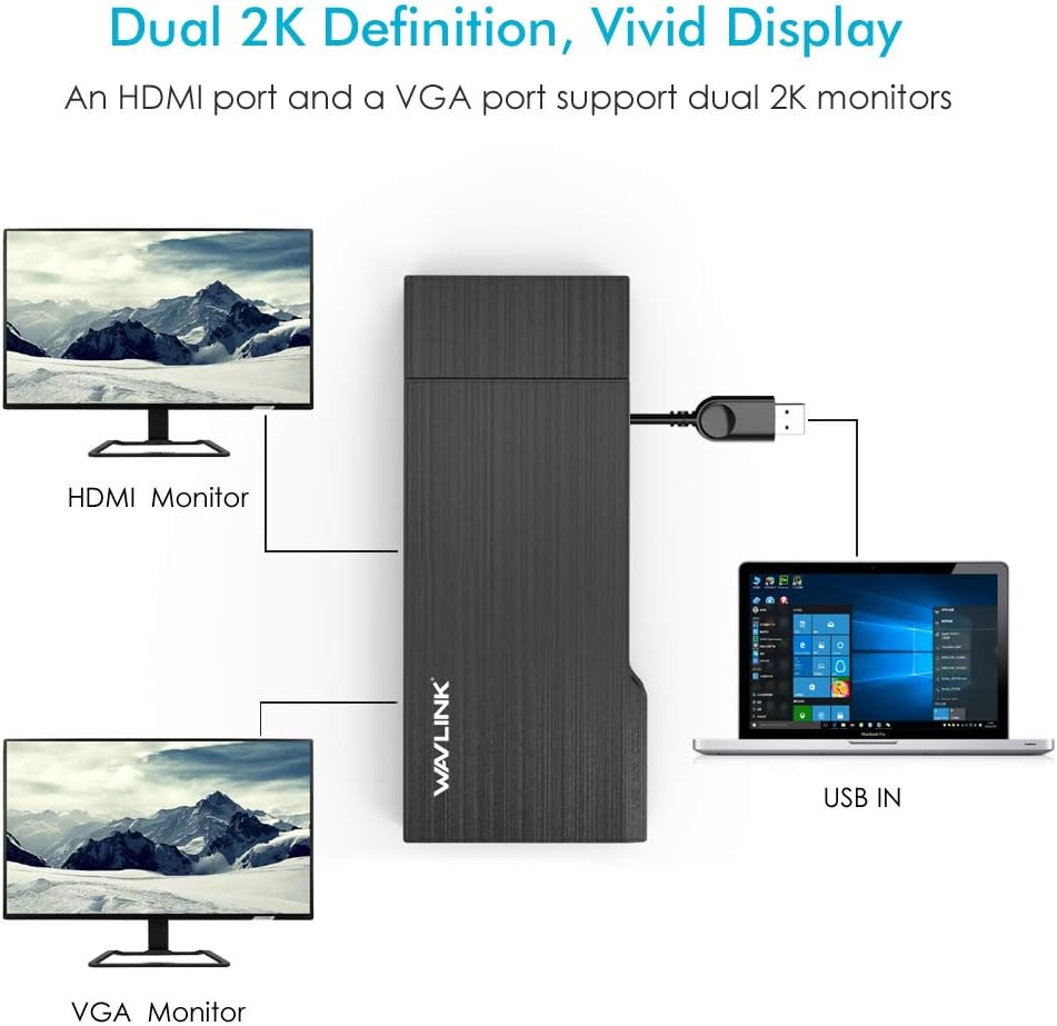 WAVLINK Universal Travel USB 3.0 Dock شاشة مزدوجة HDMI+VGA مع جيجابت إيثرنت، منفذ USB 3.0، قارئ بطاقات قابل للإزالة، HDMI حتى 2560x1440، VGA 1920x1200 لأجهزة Apple M1 وIntel Macs، Dell XPS 13/15