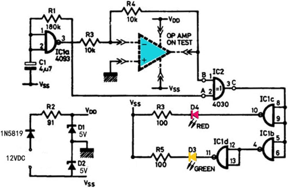 If the op amp. When the output is open, the C point of IC2 must be 0 all the time. After passing through IC1c, it becomes 1, and the red LED D4 is on.