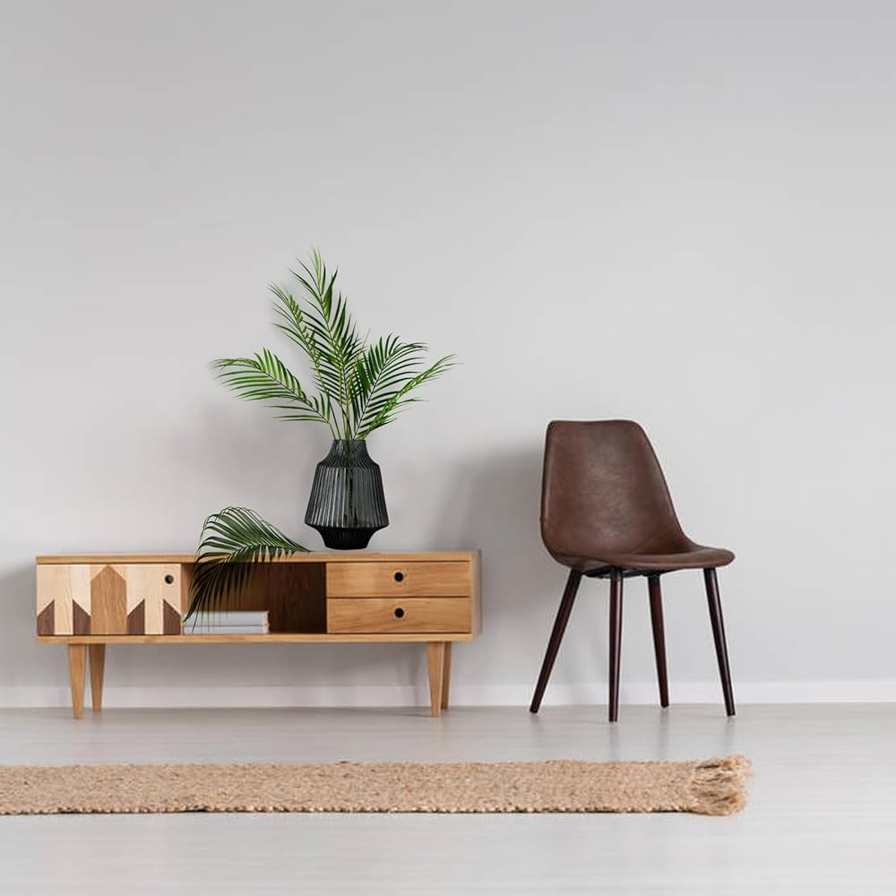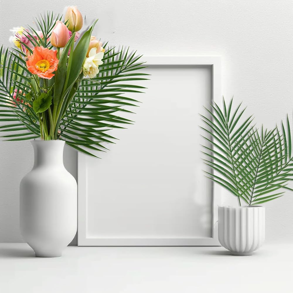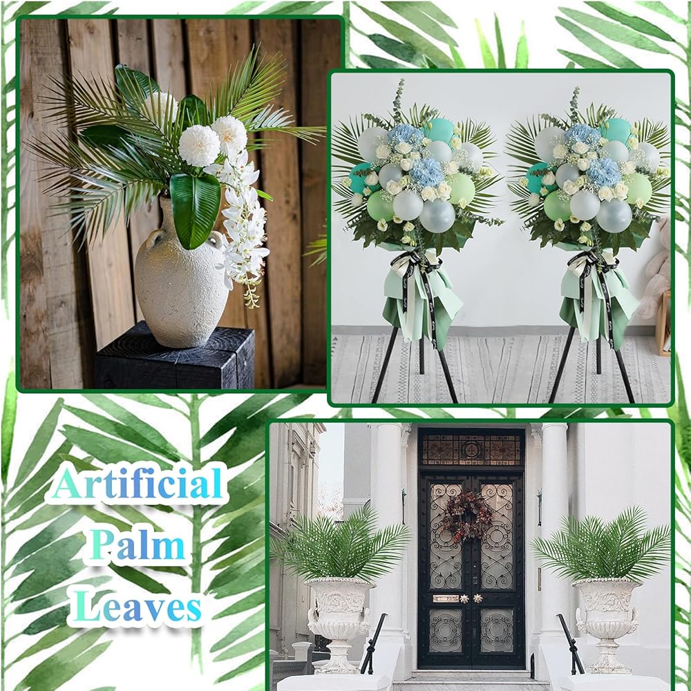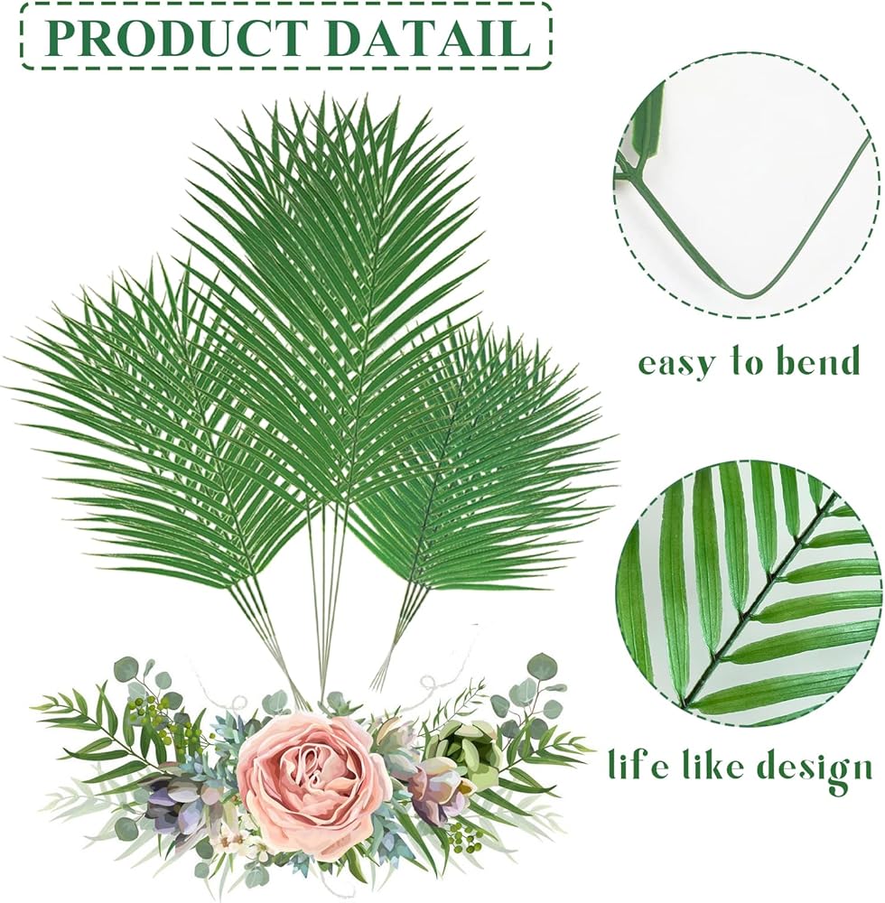 Premium Matrial: The fake palm leaves are made of premium plastic, durable and reusable. And the palm stems are iron-coated inside and they can be easily bent into shape and cut down to the desired size. They can easily to fit your vase arrangement or designed landscape.