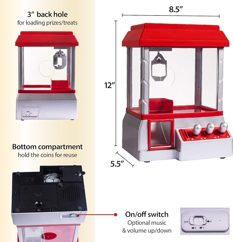 آلة الألعاب: من السهل فتح لعبة الأركيد ذات الآلة المخلبية حتى تتمكن من إعادة تحميلها بجميع أنواع الحلوى الصغيرة. احتفظ بالجوائز التي فزت بها أو ضعها مرة أخرى في آلة توزيع الألعاب. *الألعاب والحلوى غير متضمنة.