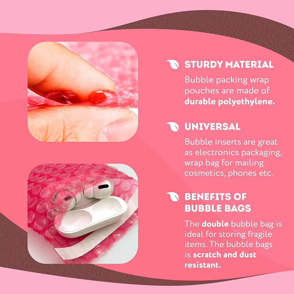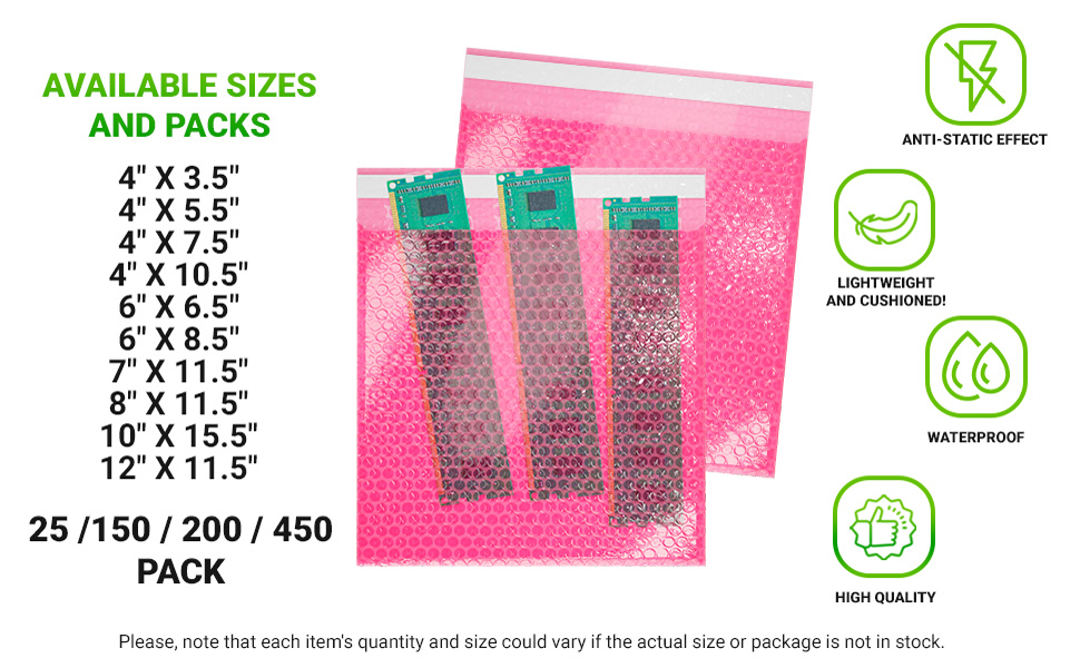 تعتبر Pink Bubble Pouch مقاس 4 × 3.5 بوصة الخيار الأمثل لحماية الأجهزة الحساسة للكهرباء الساكنة والأشياء الهشة/الحساسة ومنع الخدوش عليها أثناء الشحن والنقل والتخزين. ستصبح حقيبة الفقاعات وسيلة أساسية للحماية الإضافية. كمية. 25 قطعة في كل عبوة.