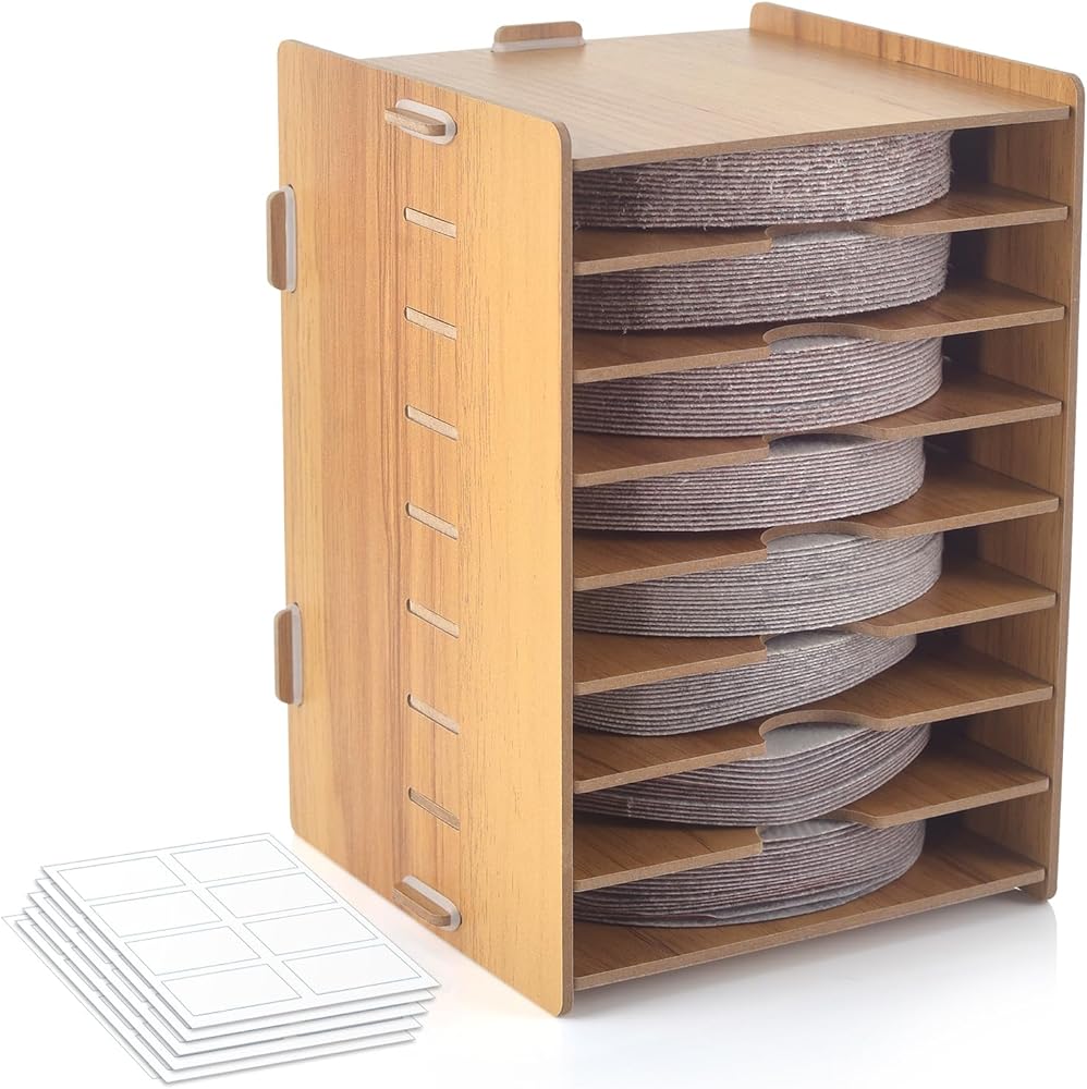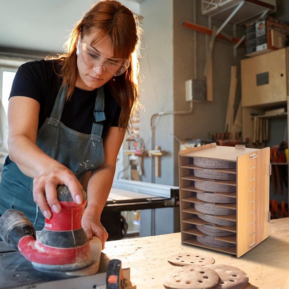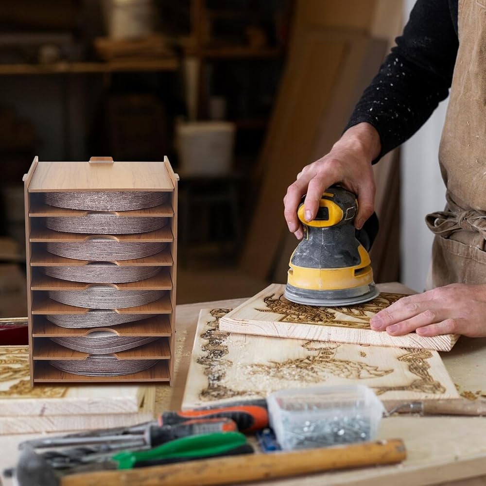 Superior material: 3mm thick density board makes the storage rack stronger and more durable, can store various grit of 5-inch sanding disc. The cherry wood color is perfectly integrated with your workplace. Add a premium texture to your desktop and optimize work environment.